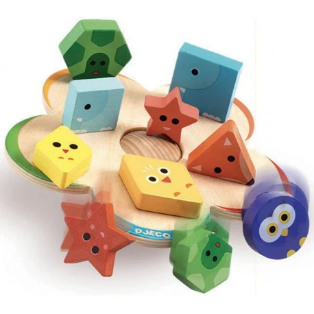 Jeu d’équilibre et d’adresse pour les plus jeunes. Chaque joueur à son tour jette le dé puis ajoute sur la base une pièce de la couleur indiquée. Le gagnant est le dernier à avoir joué avant que la tour s’effondre. Un jeu tout simple, facilement modulable. Les plus jeunes peuvent y jouer librement, seul ou à deux, en essayant de placer un maximum de pièces. Un jeu qui demande de la concentration, de la dextérité et qui permet de se familiariser avec 6 formes géométriques!