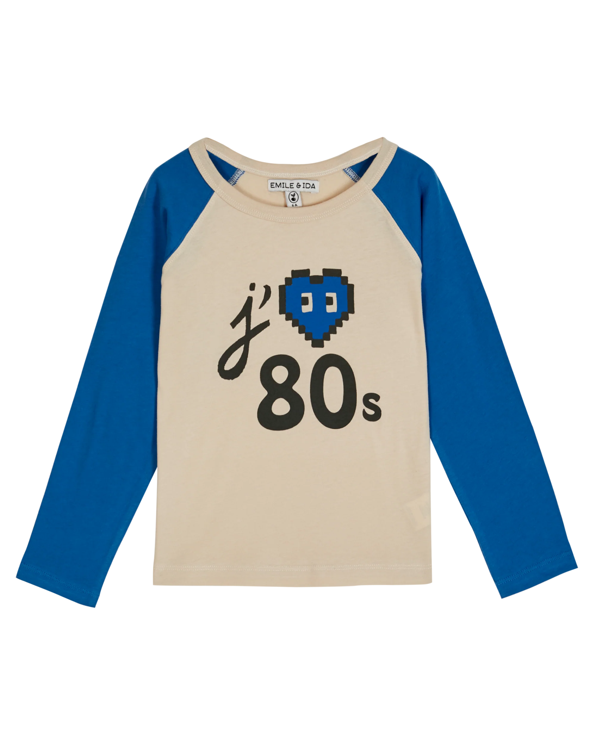 Le raglan des emmanchures surpiqué délimite les couleurs : bleu des manches longues et écru du corps dont le print clame, avec son cœur bleu, l’amour des années 80. L’encolure ronde est bordée par un bord-côte écru.