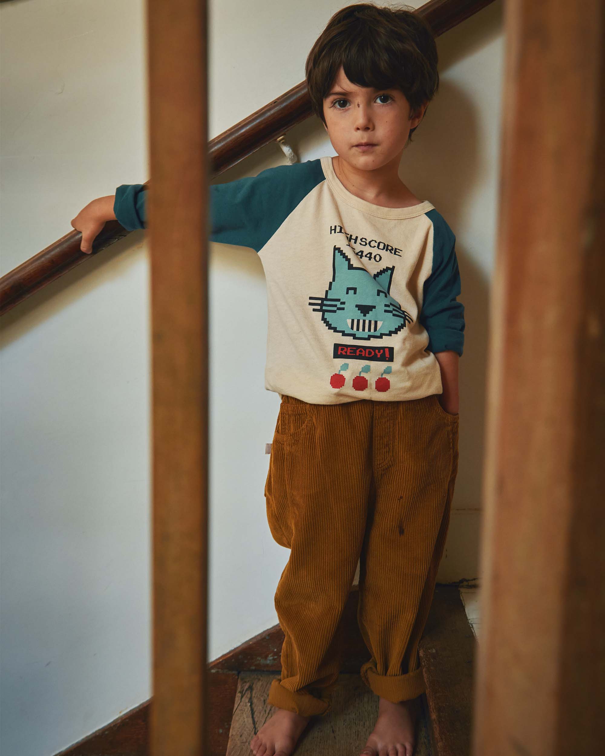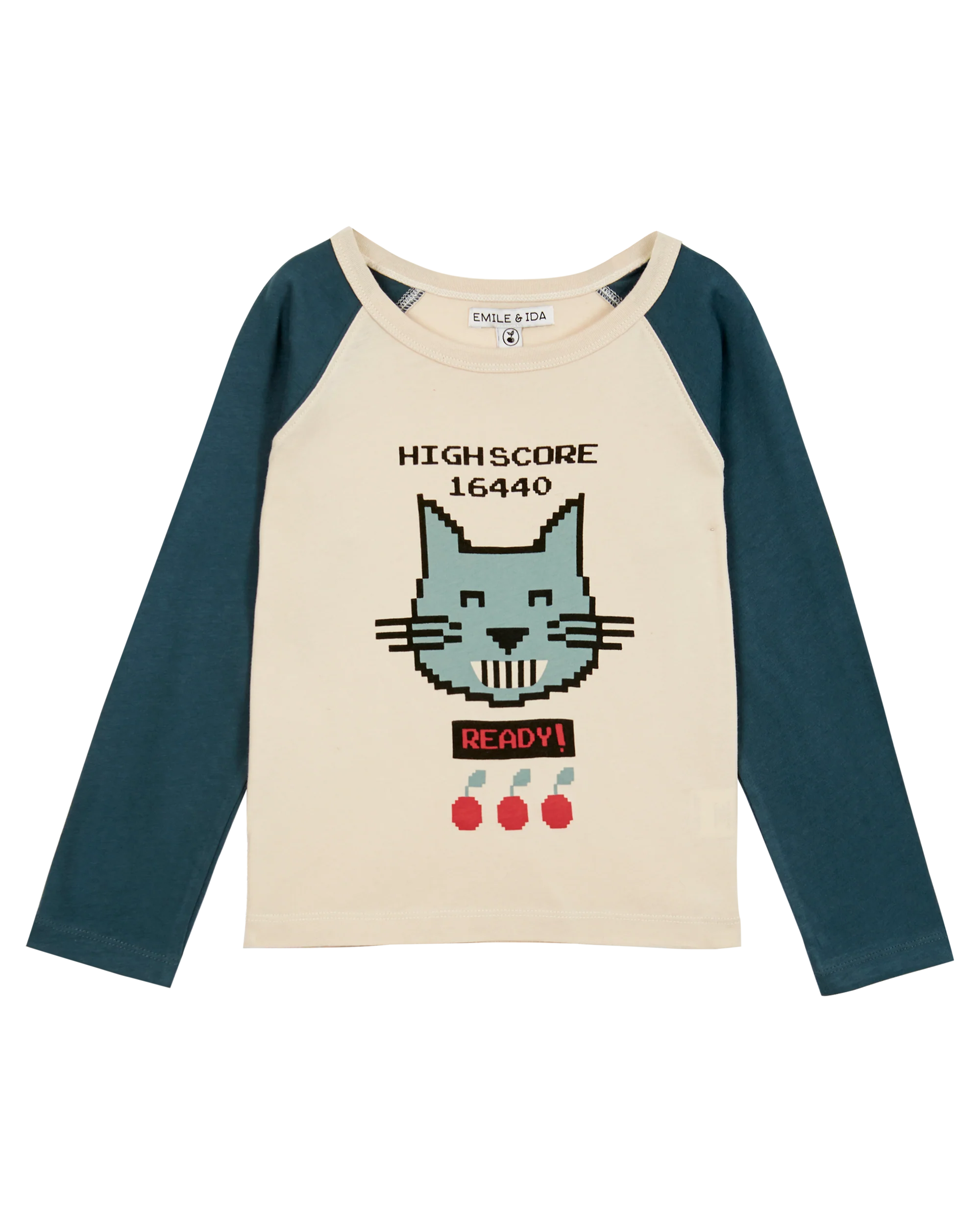 Le raglan des emmanchures surpiqué délimite les couleurs : vert des manches longues et écru du corps dont le print, tête de chat pixellisée, nous rappelle les premiers jeux vidéo. L’encolure ronde est bordée par un bord-côte écru.