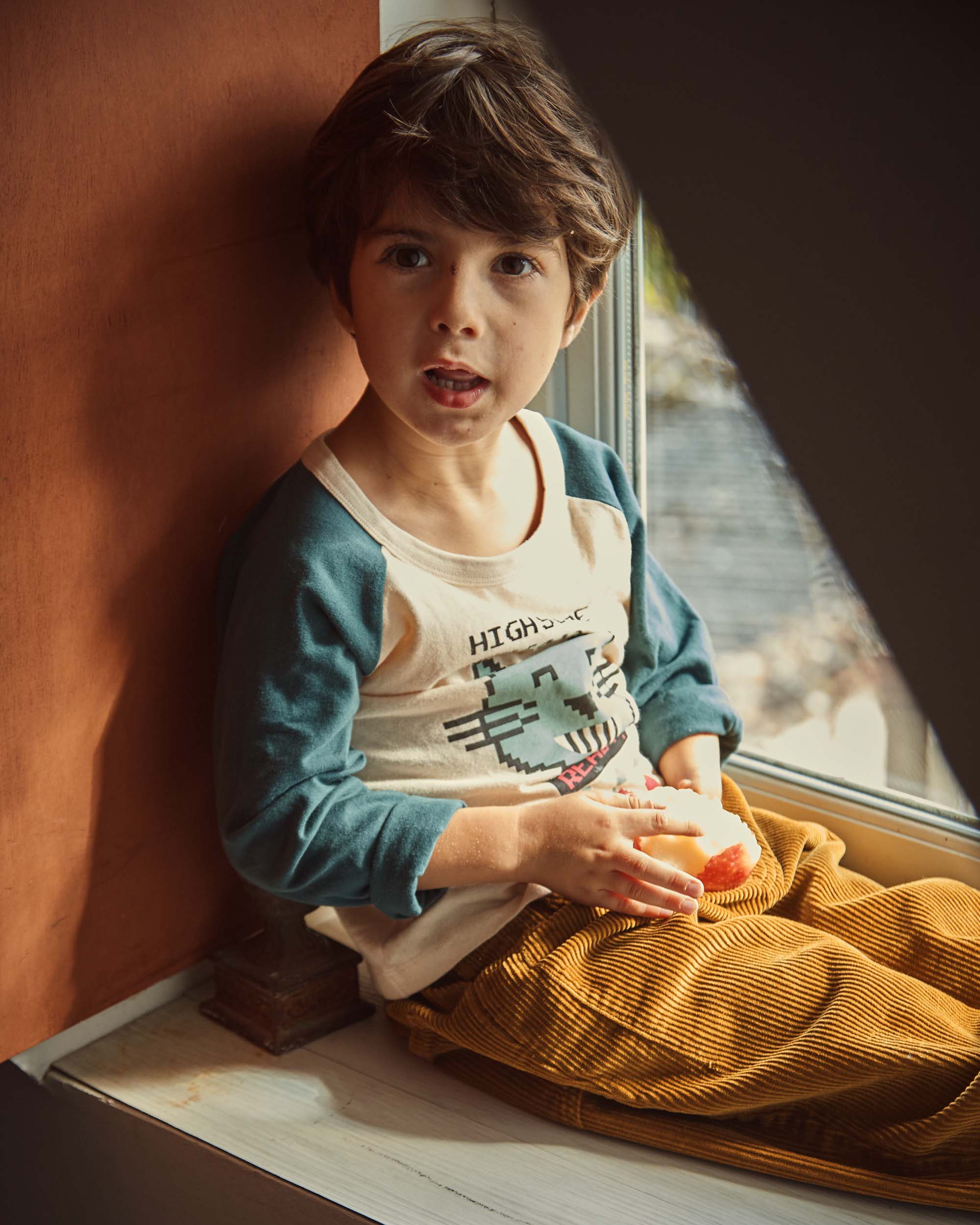 Tee-shirt en jersey de coton biologique écru et vert sapin. On vous emmène pour une petite balade dans les années 80. Le raglan des emmanchures surpiqué délimite les couleurs : vert des manches longues et écru du corps dont le print, tête de chat pixellisée, nous rappelle les premiers jeux vidéo. L’encolure ronde est bordée […]