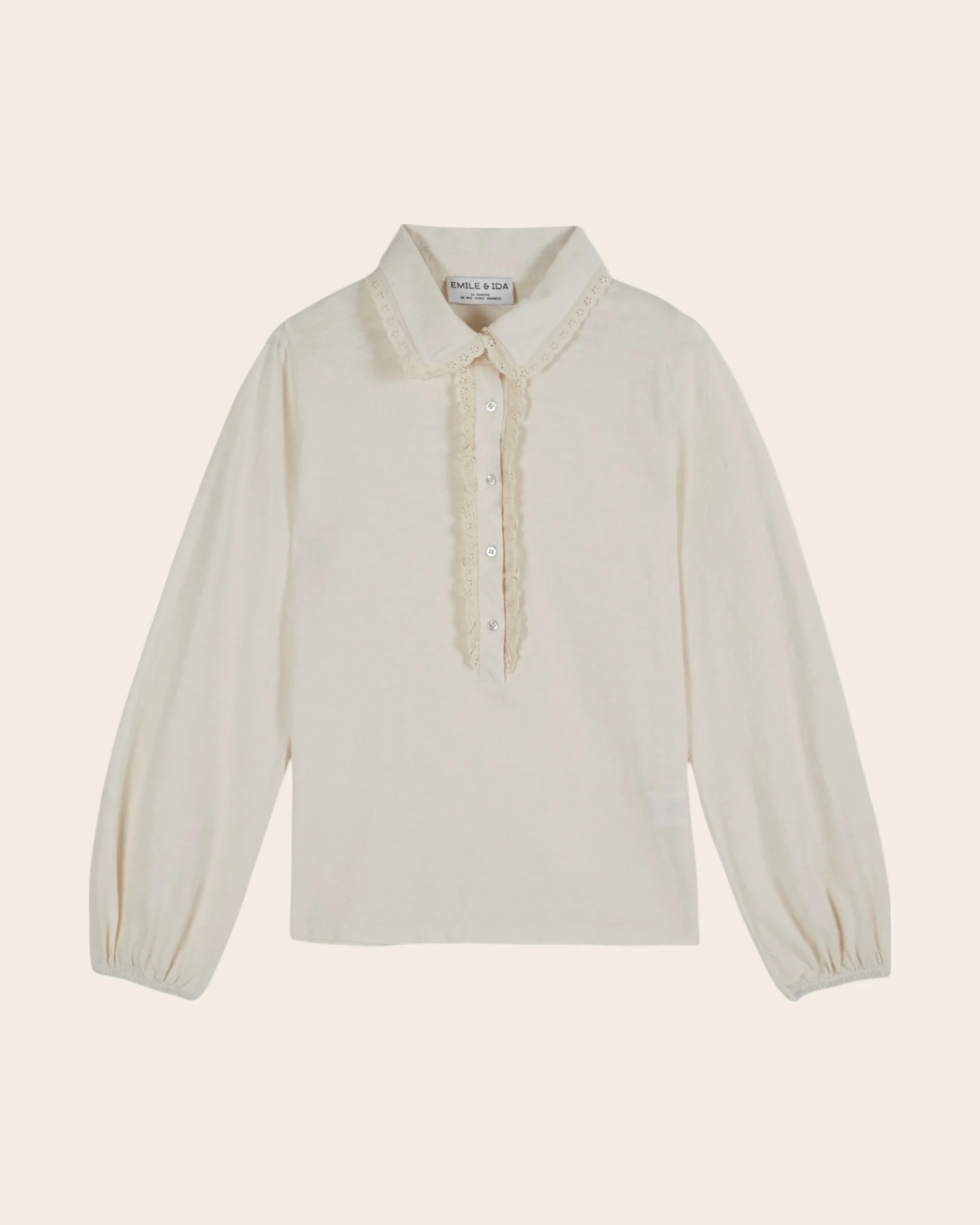 Tee-shirt manches longues en coton biologique crème. – Coupe légèrement évasée – Col et patte de boutonnage bordés d’un galon de broderie anglaise – Manches longues élastiquées aux poignets