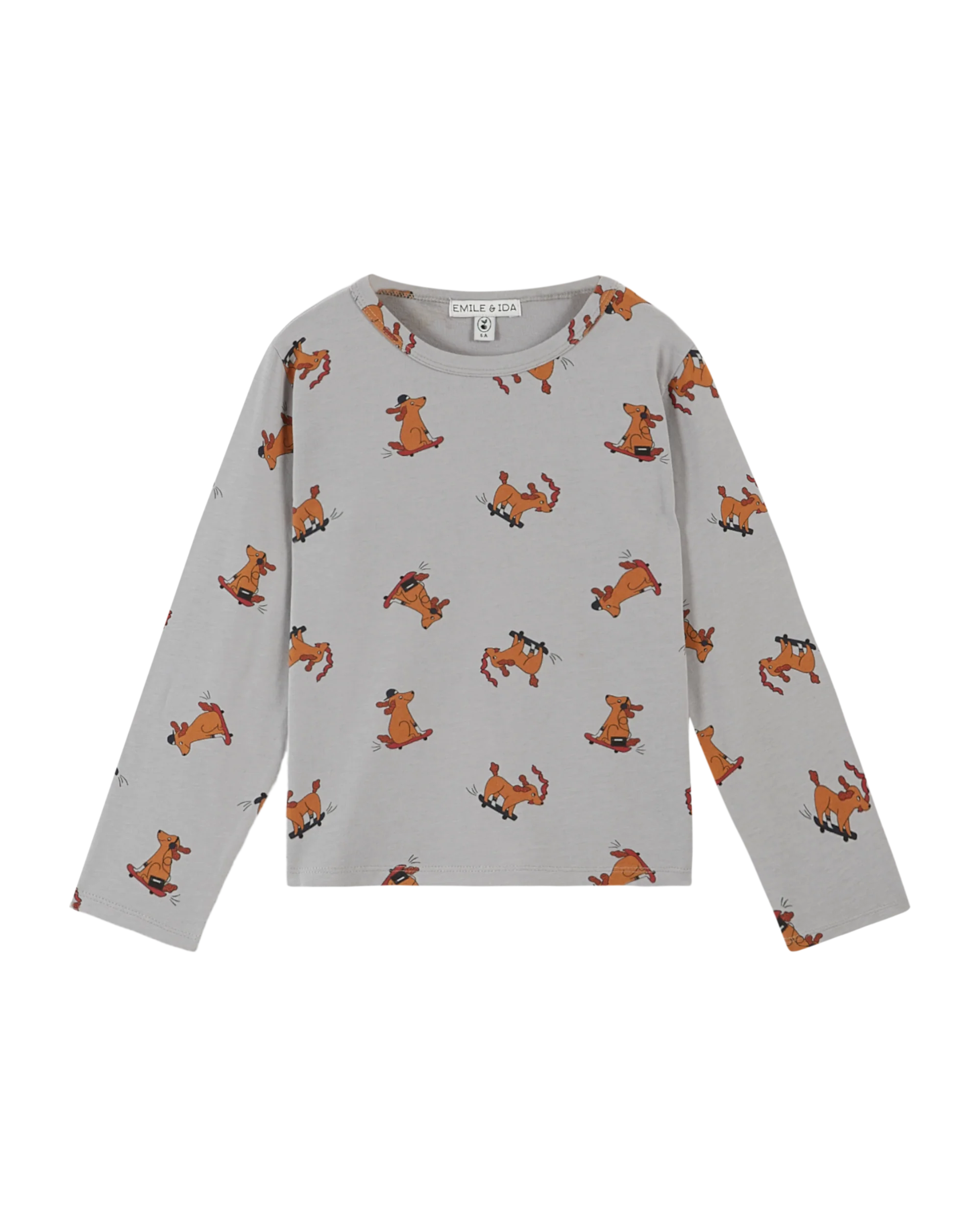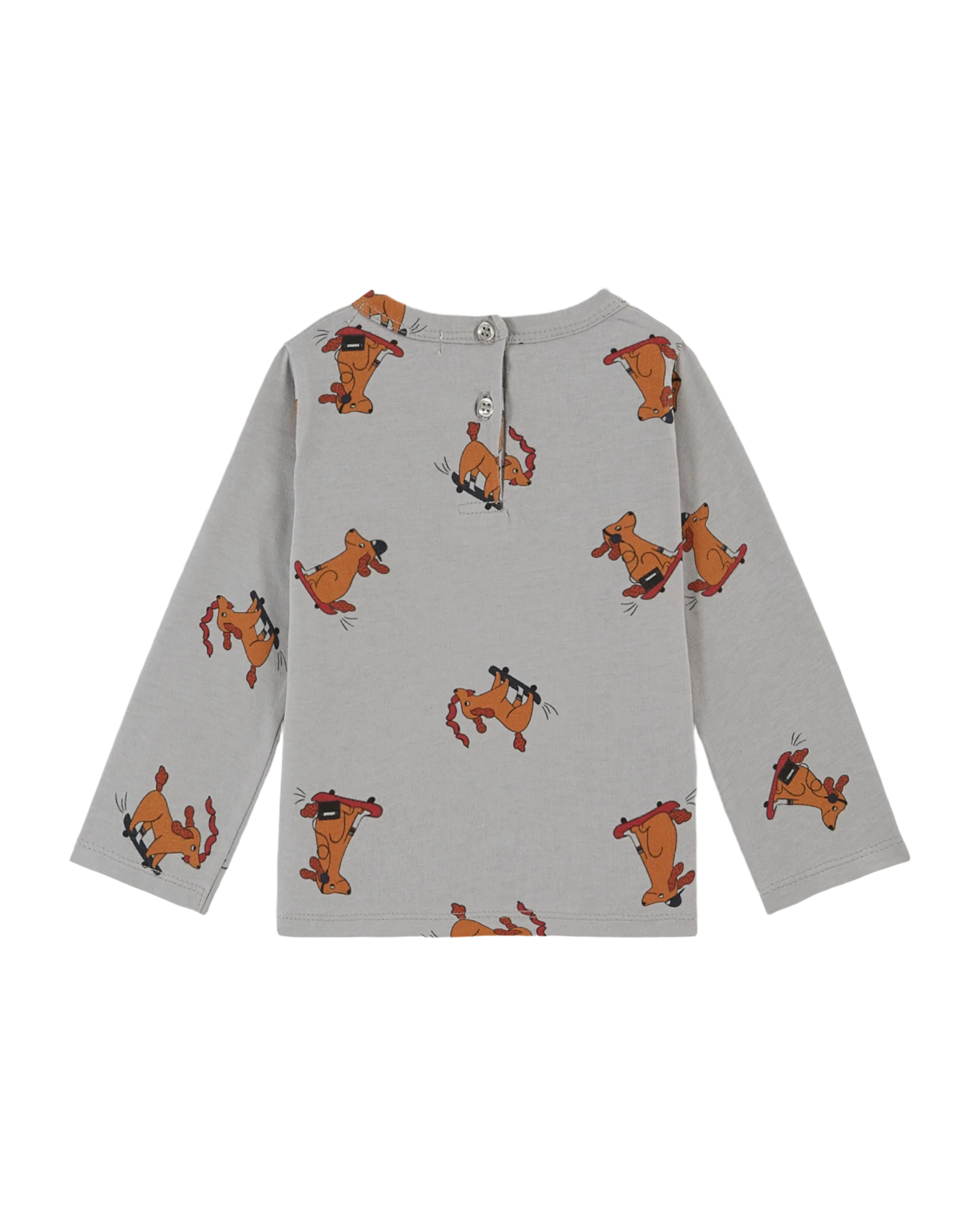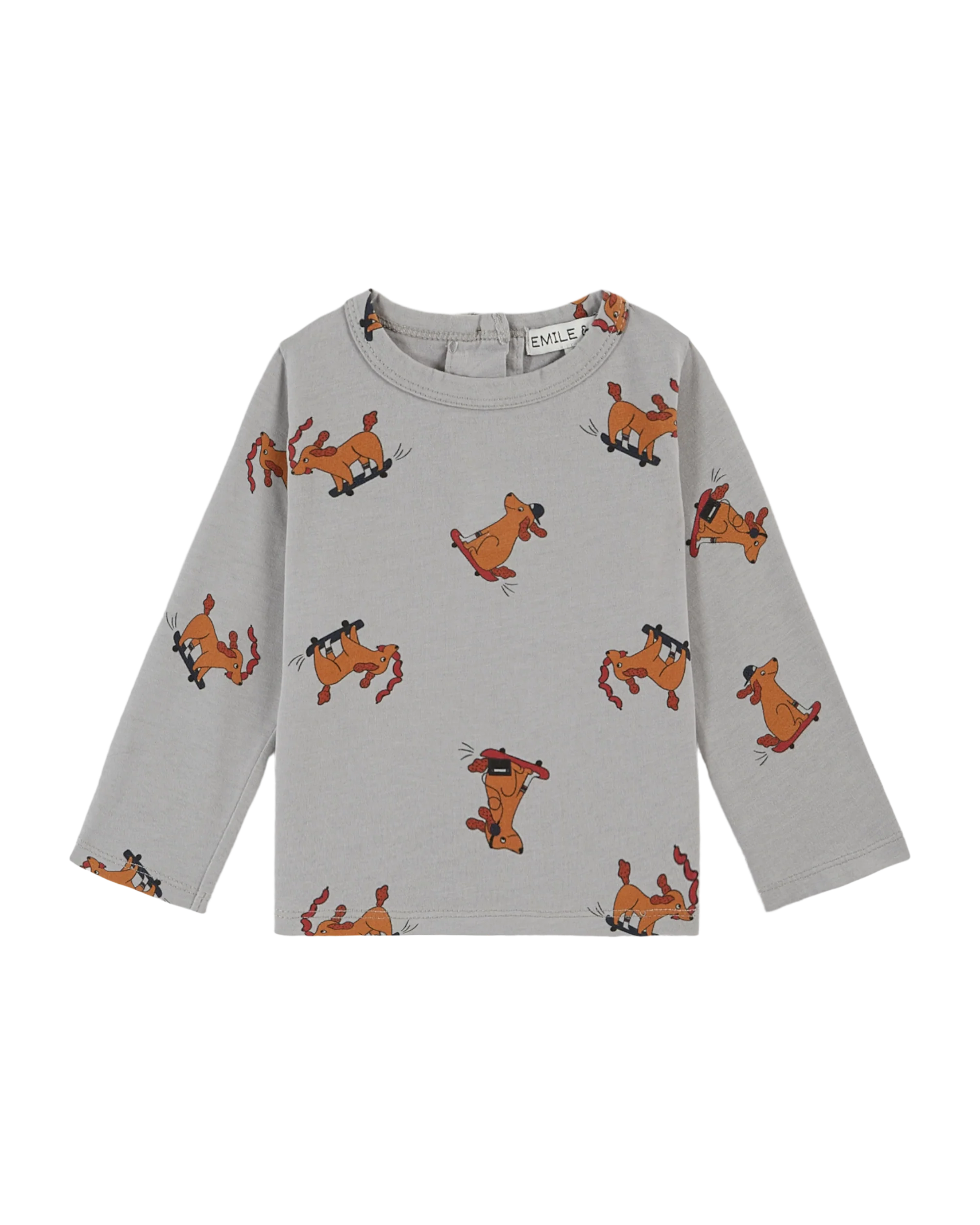 Tee-shirt en jersey de coton biologique gris sur lequel s’amusent des chiens facétieux. Ils font du skateboard assis, debout ou couchés, font des pirouettes ou se sauvent après avoir dérobé un chapelet de saucisses.