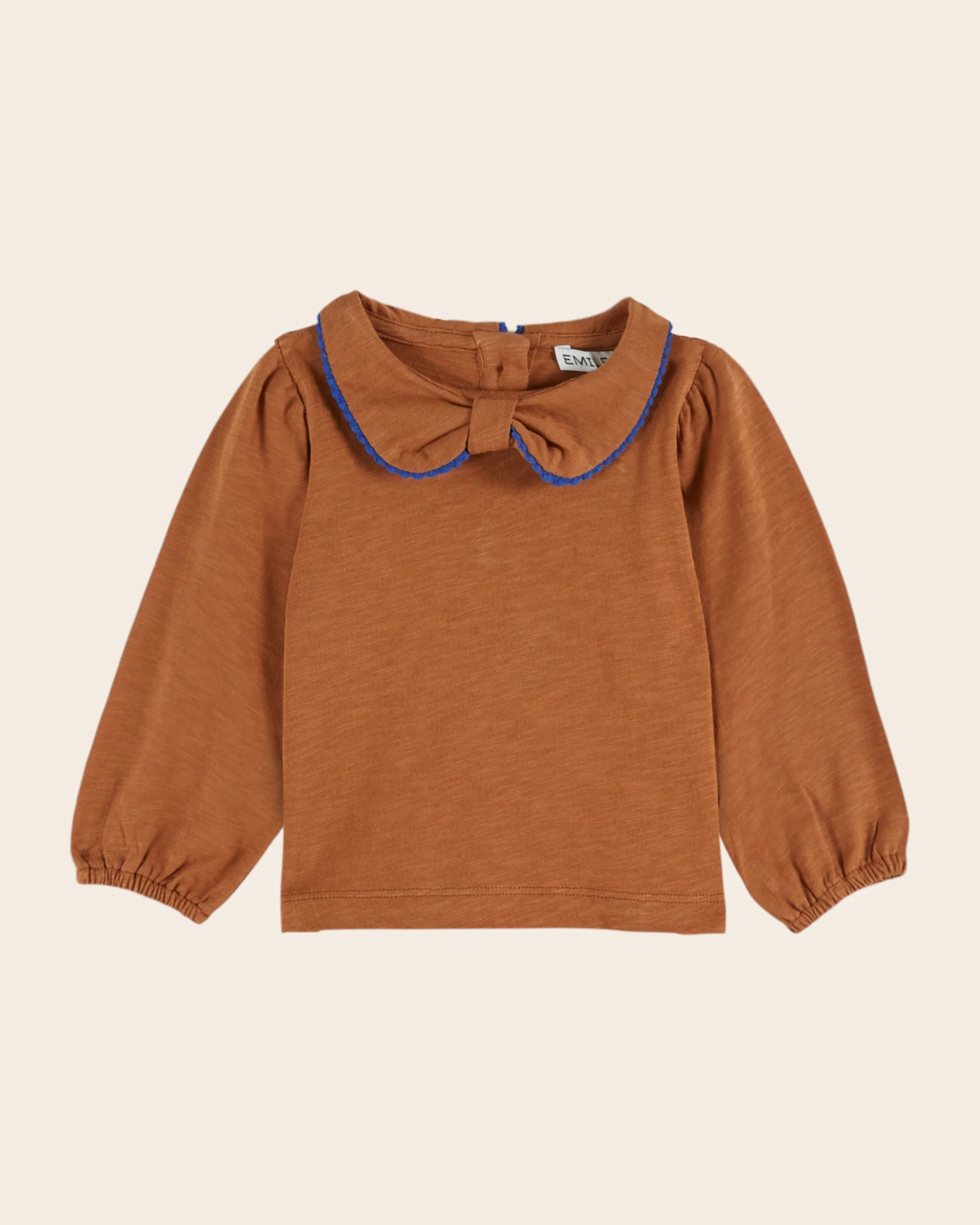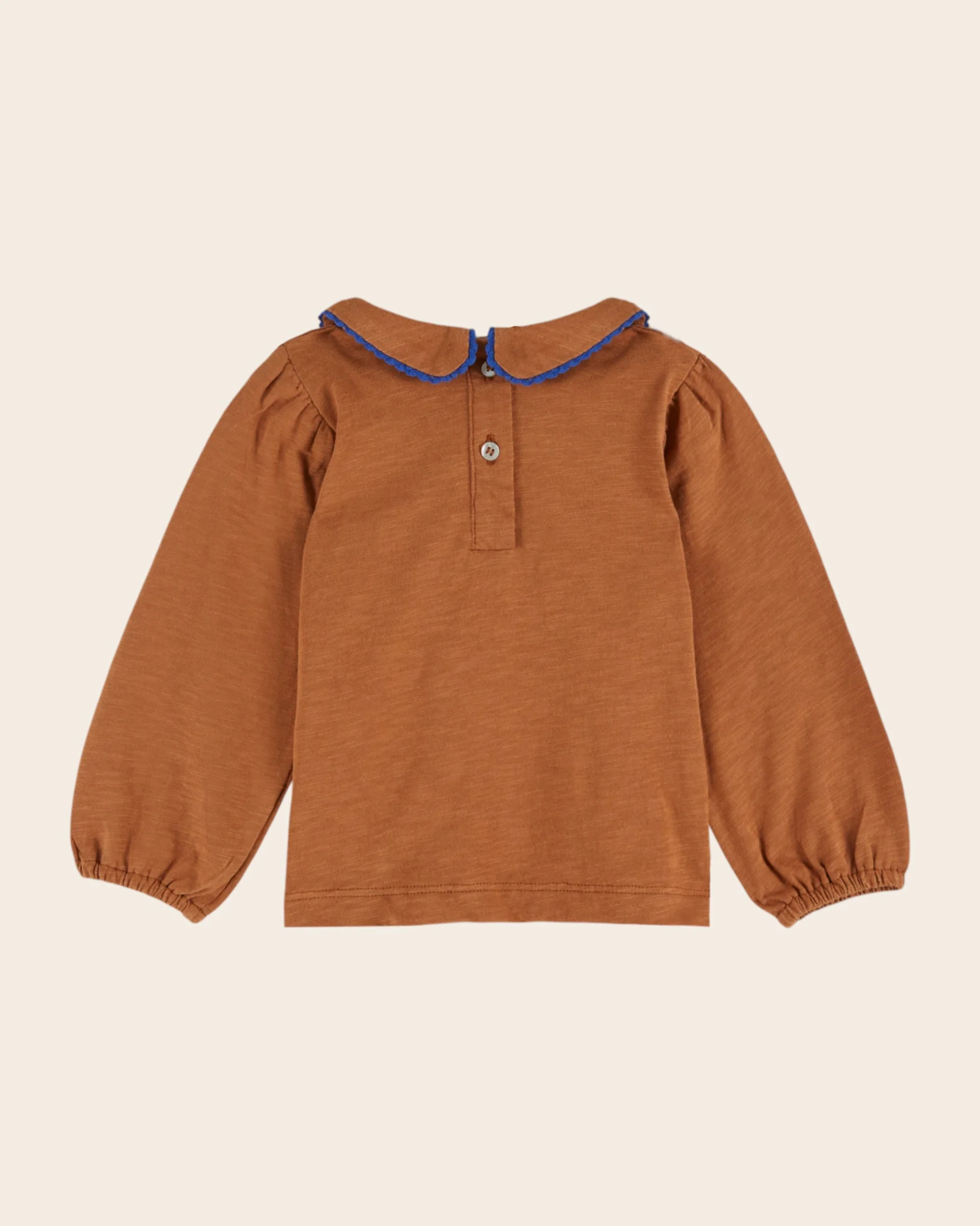 Tee-shirt en jersey de coton biologique flammé caramel avec un petit col ceint par un galon festonné ton sur ton, resserré sous le menton. – Coupe droite – Encolure ronde – Manches longues élastiquées aux poignets – Ourlet surpiqué autour de la base – Ouverture boutonnée dans le dos pour les tailles bébé