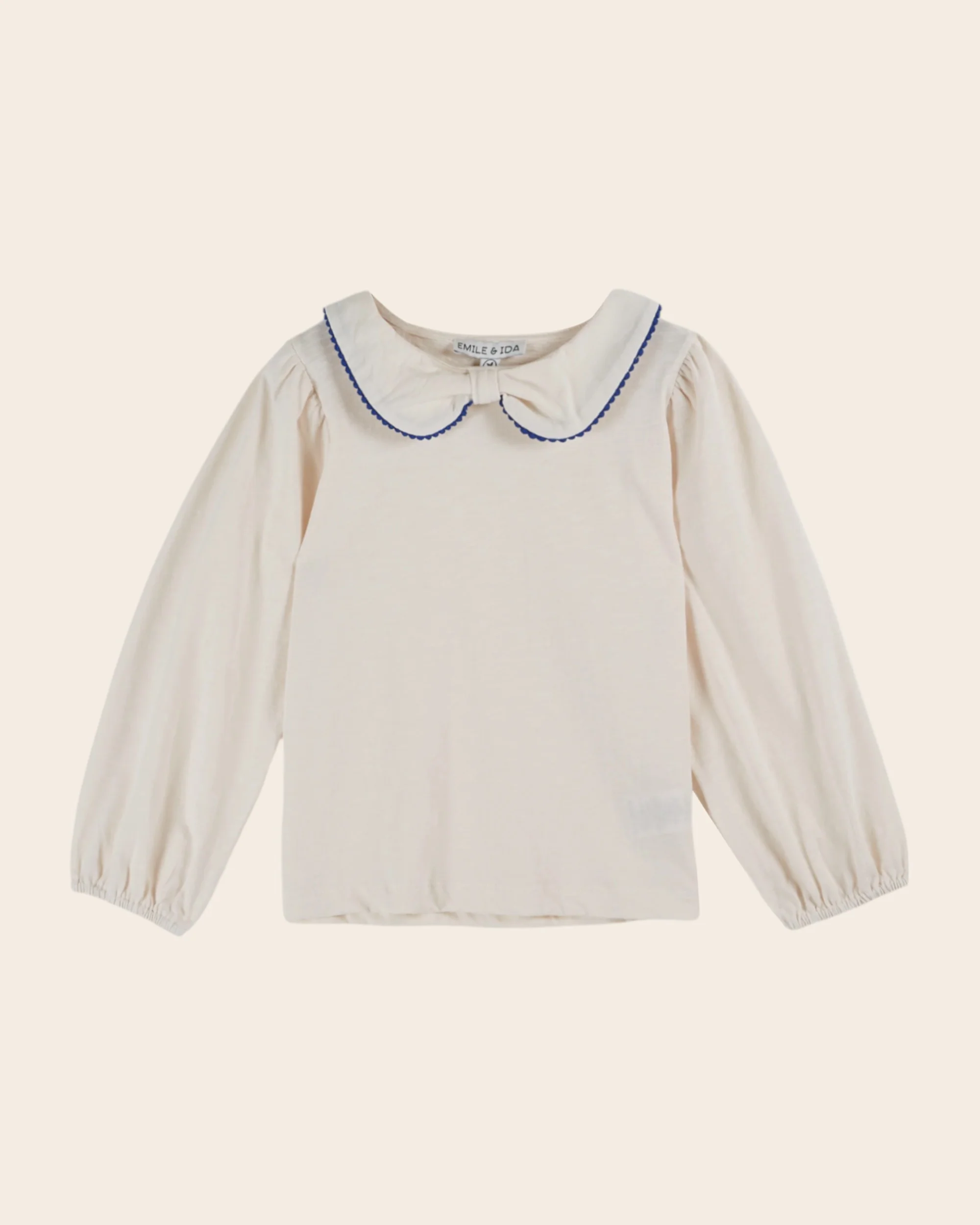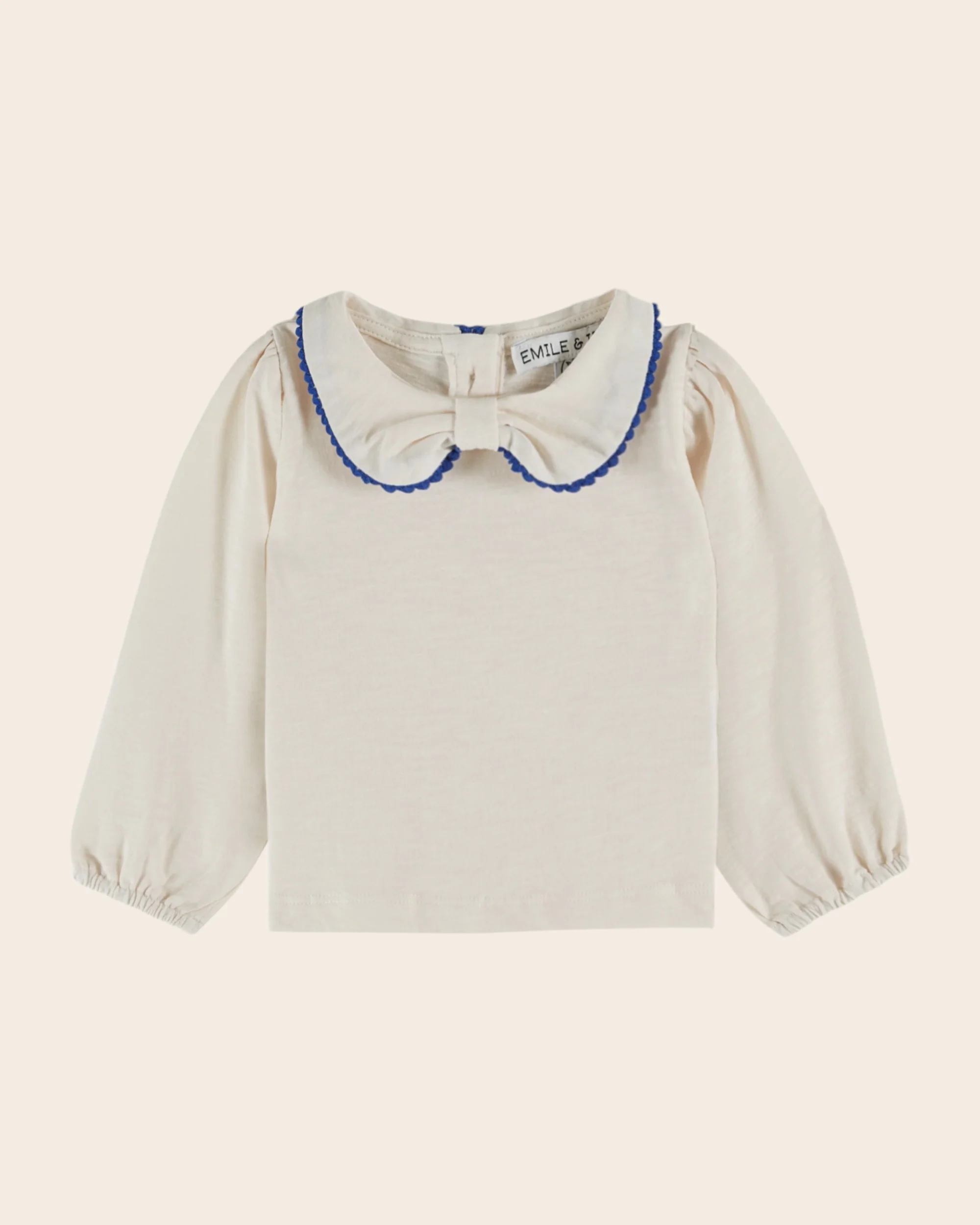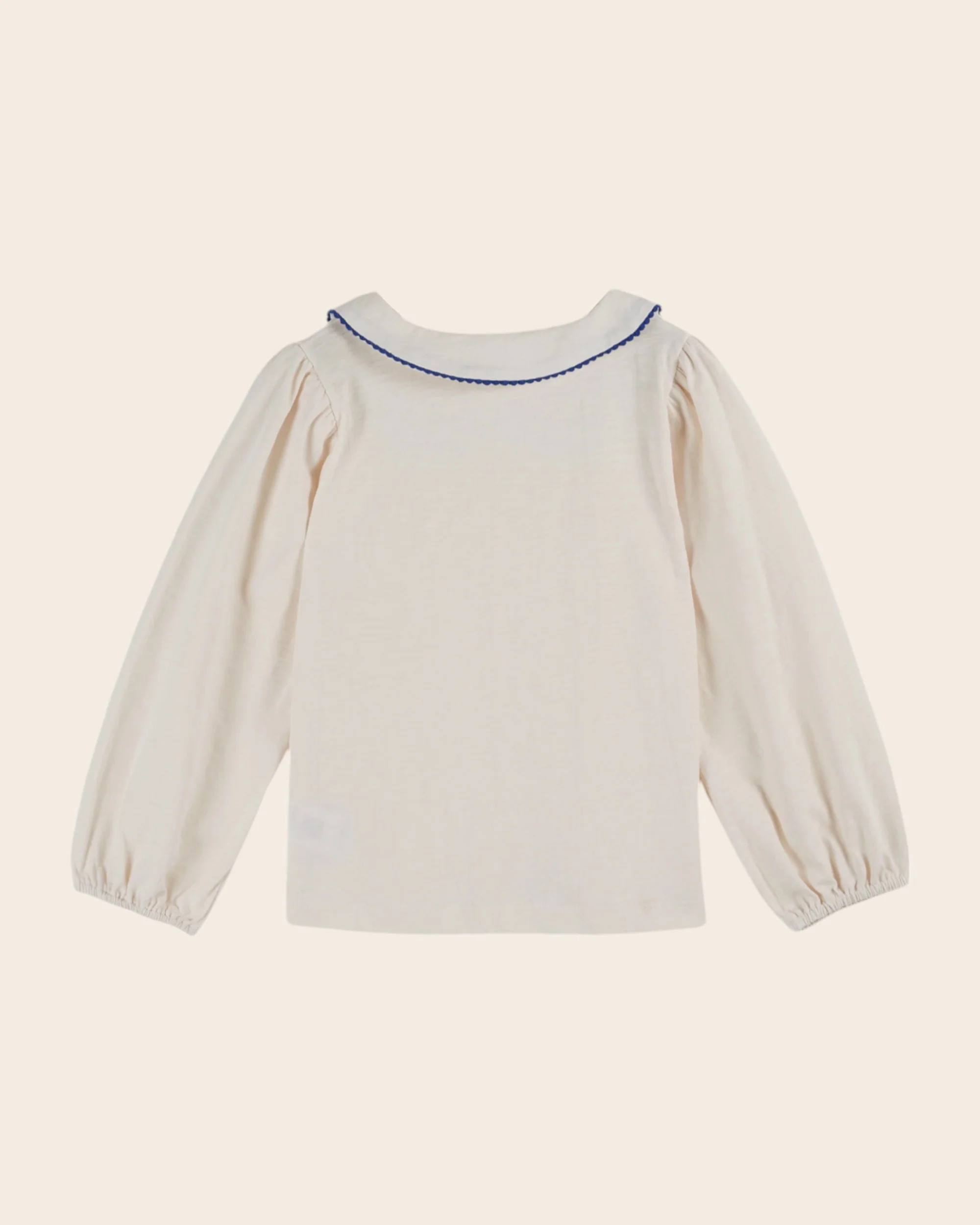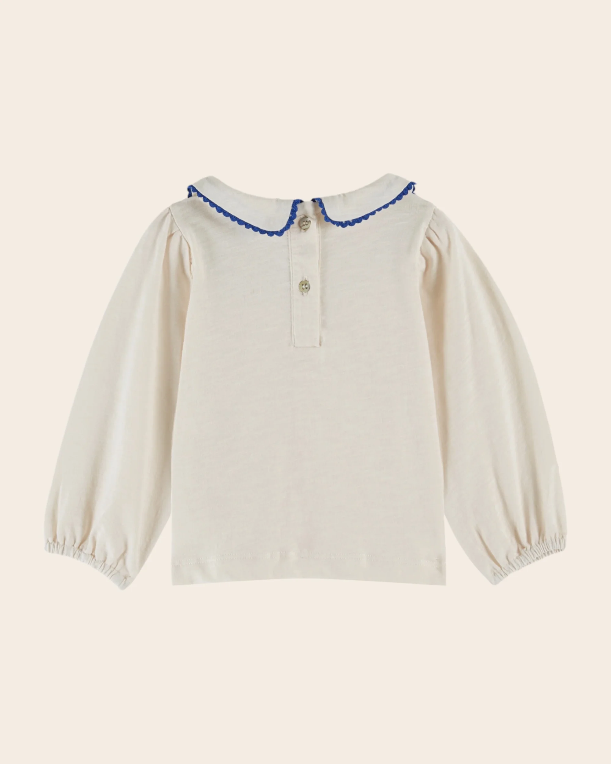 Tee-shirt en jersey de coton biologique flammé crème avec un petit col ceint par un galon festonné ton sur ton, resserré sous le menton. – Coupe droite – Encolure ronde – Manches longues élastiquées aux poignets – Ourlet surpiqué autour de la base – Ouverture boutonnée dans le dos pour les tailles bébé