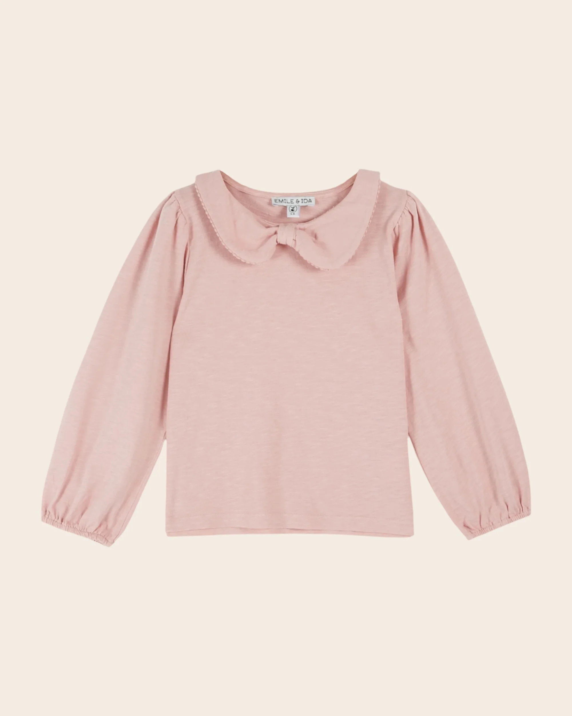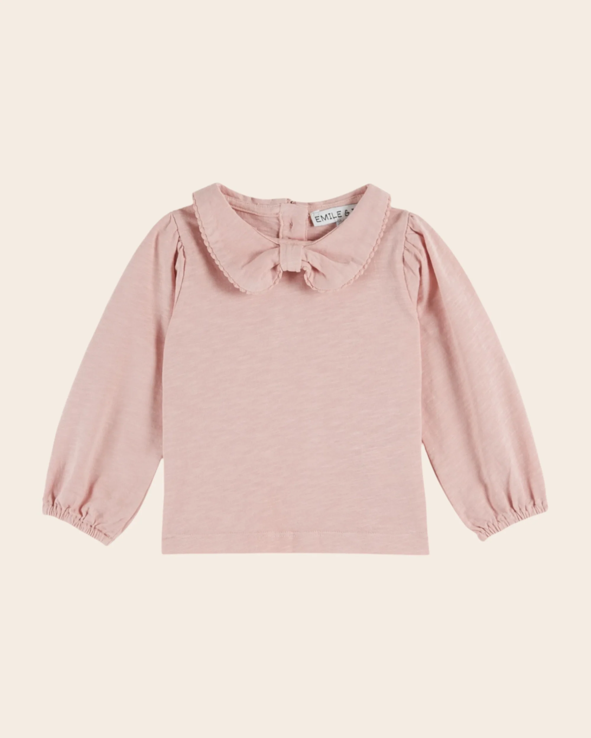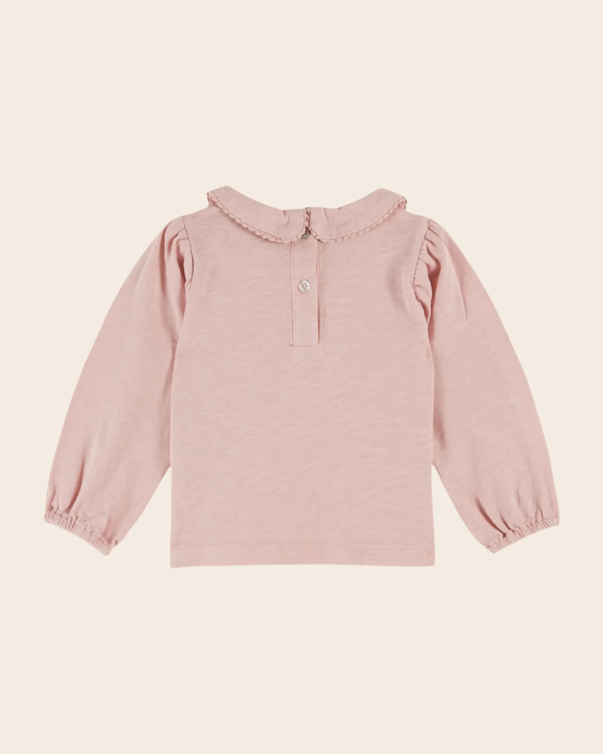 Tee-shirt en jersey de coton biologique flammé rose avec un petit col ceint par un galon festonné ton sur ton, resserré sous le menton. – Coupe droite – Encolure ronde – Manches longues élastiquées aux poignets – Ourlet surpiqué autour de la base – Ouverture boutonnée dans le dos pour les tailles bébé