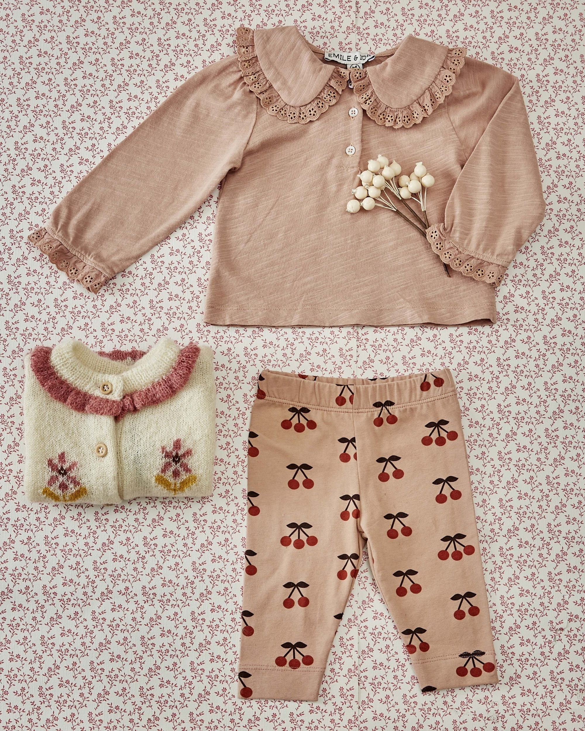 Tee-shirt en jersey de coton biologique rose poudré. Encore un tee-shirt qui ne ressemble à aucun autre. En effet, le grand col qui entoure l’encolure ronde et recouvre les épaules, la patte de boutonnage façon polo et les poignets élastiqués des manches longues sont ornés d’une bande de broderie anglaise froncée ton sur ton. Une […]