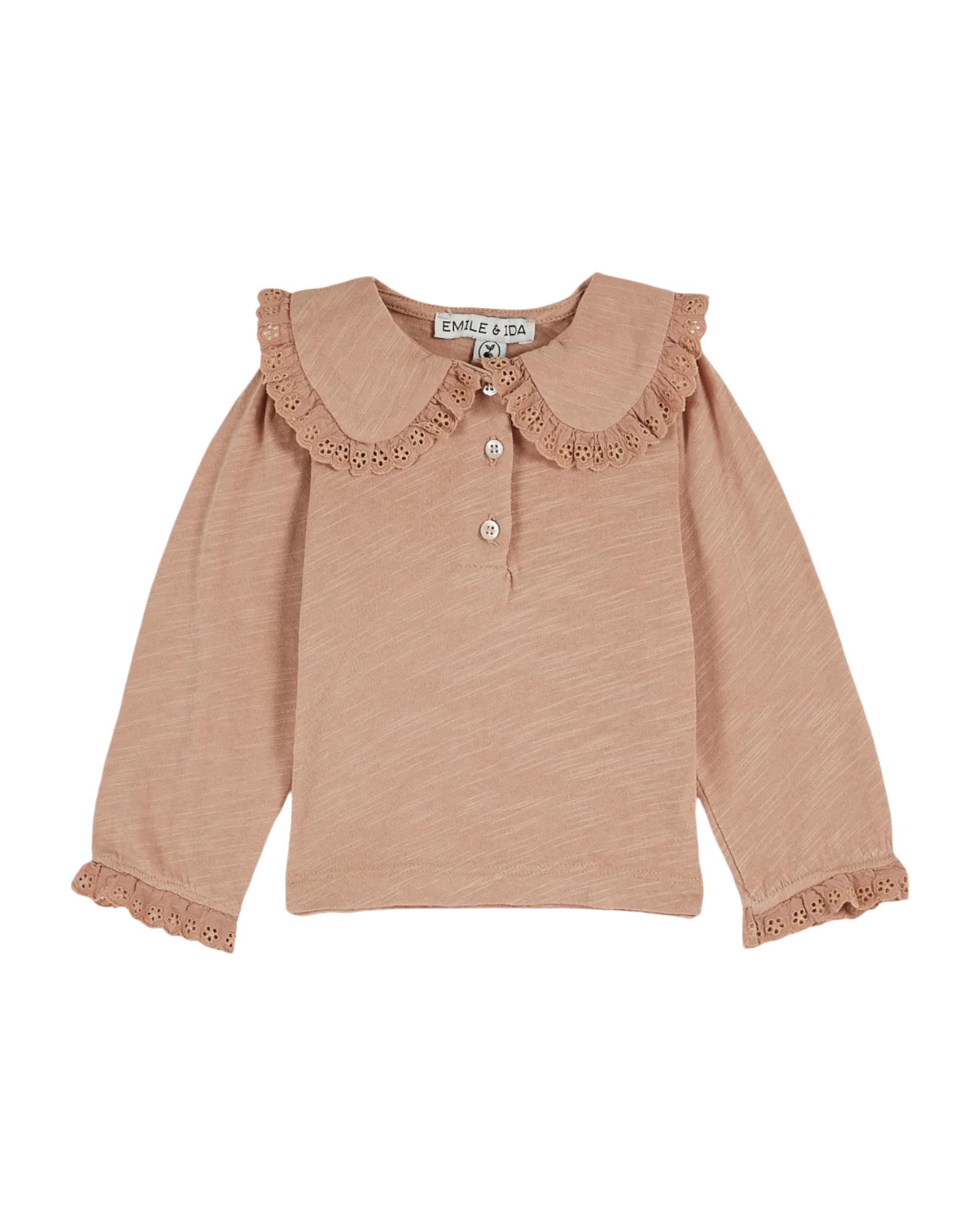 Encore un tee-shirt qui ne ressemble à aucun autre. En effet, le grand col qui entoure l’encolure ronde et recouvre les épaules, la patte de boutonnage façon polo et les poignets élastiqués des manches longues sont ornés d’une bande de broderie anglaise froncée ton sur ton.