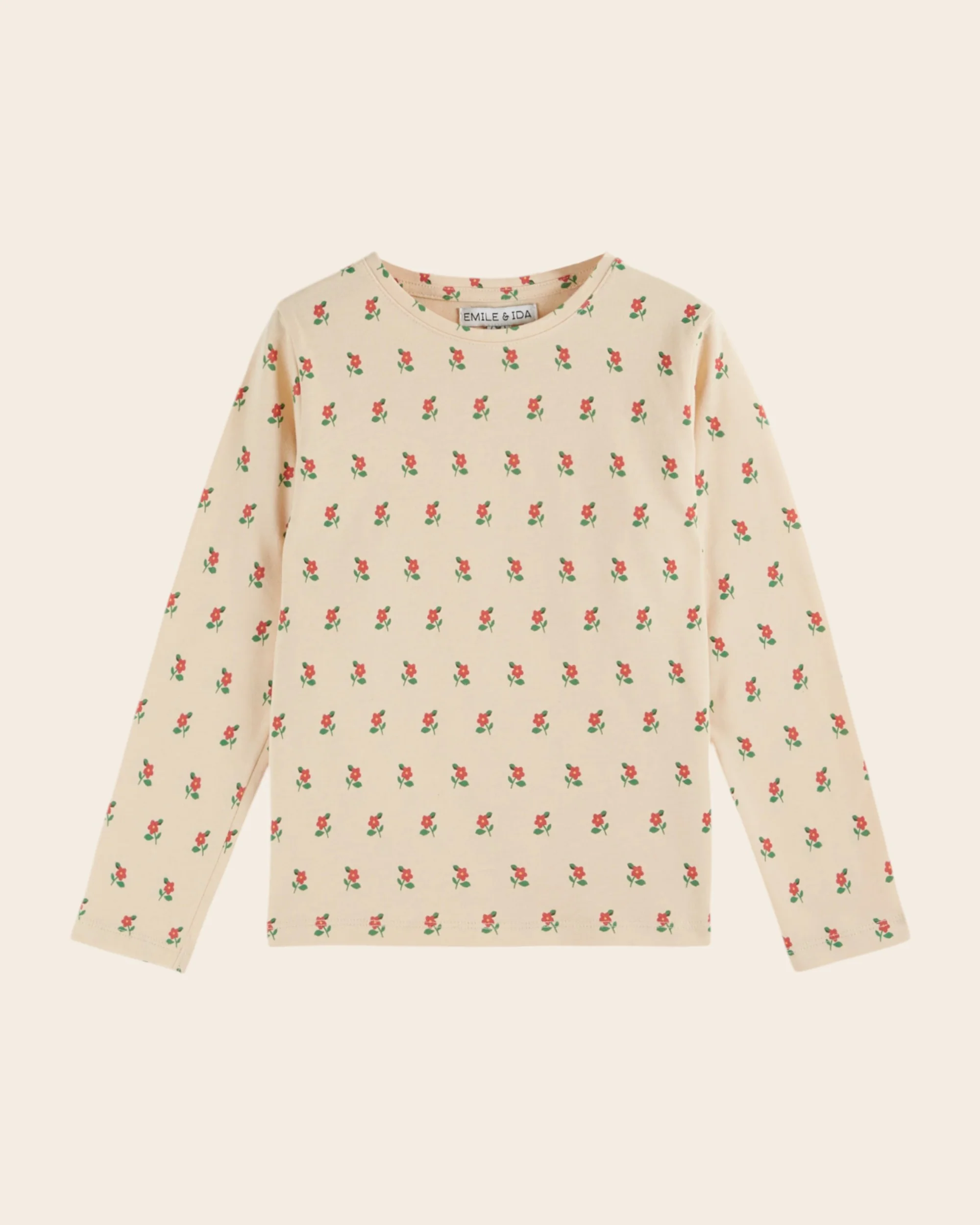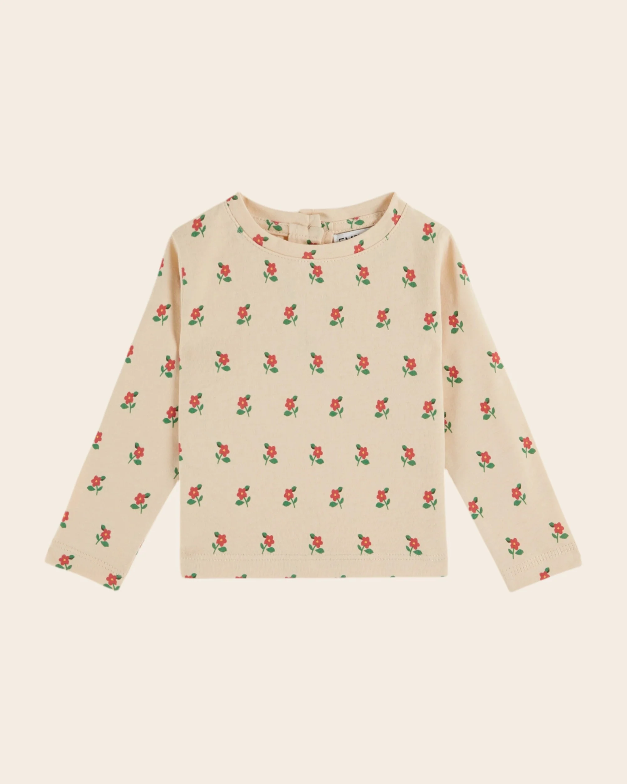 Tee-shirt en jersey de coton biologique crème imprimé de coquelicots rouges en all-over. – Coupe droite – Bord-côte autour de l’encolure – Manches longues ourlées aux poignets – Patte de boutonnage dans le dos pour les tailles bébé