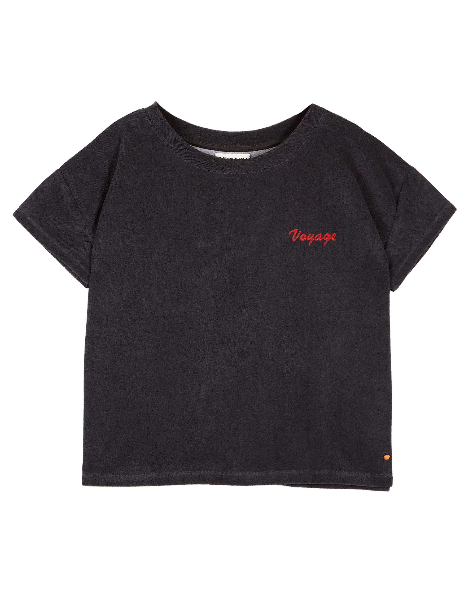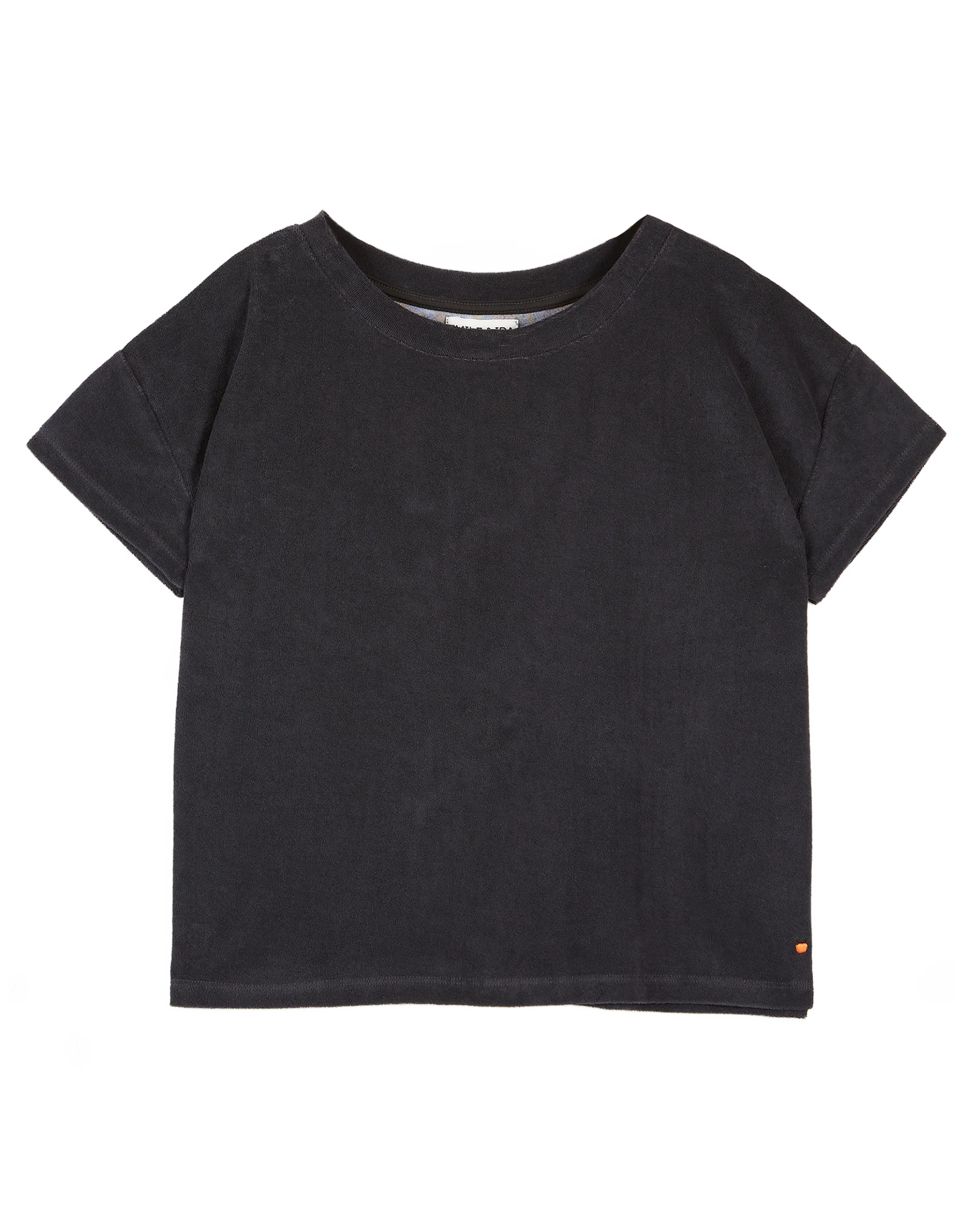 Tee-shirt en tissu éponge bitume. On aime le mélange de coton et de polyester tout doux, moelleux et confortable. Le polyester, ajouté au coton en toute petite quantité, confère au tissu une élasticité exceptionnelle et lui permet de ne pas se froisser.