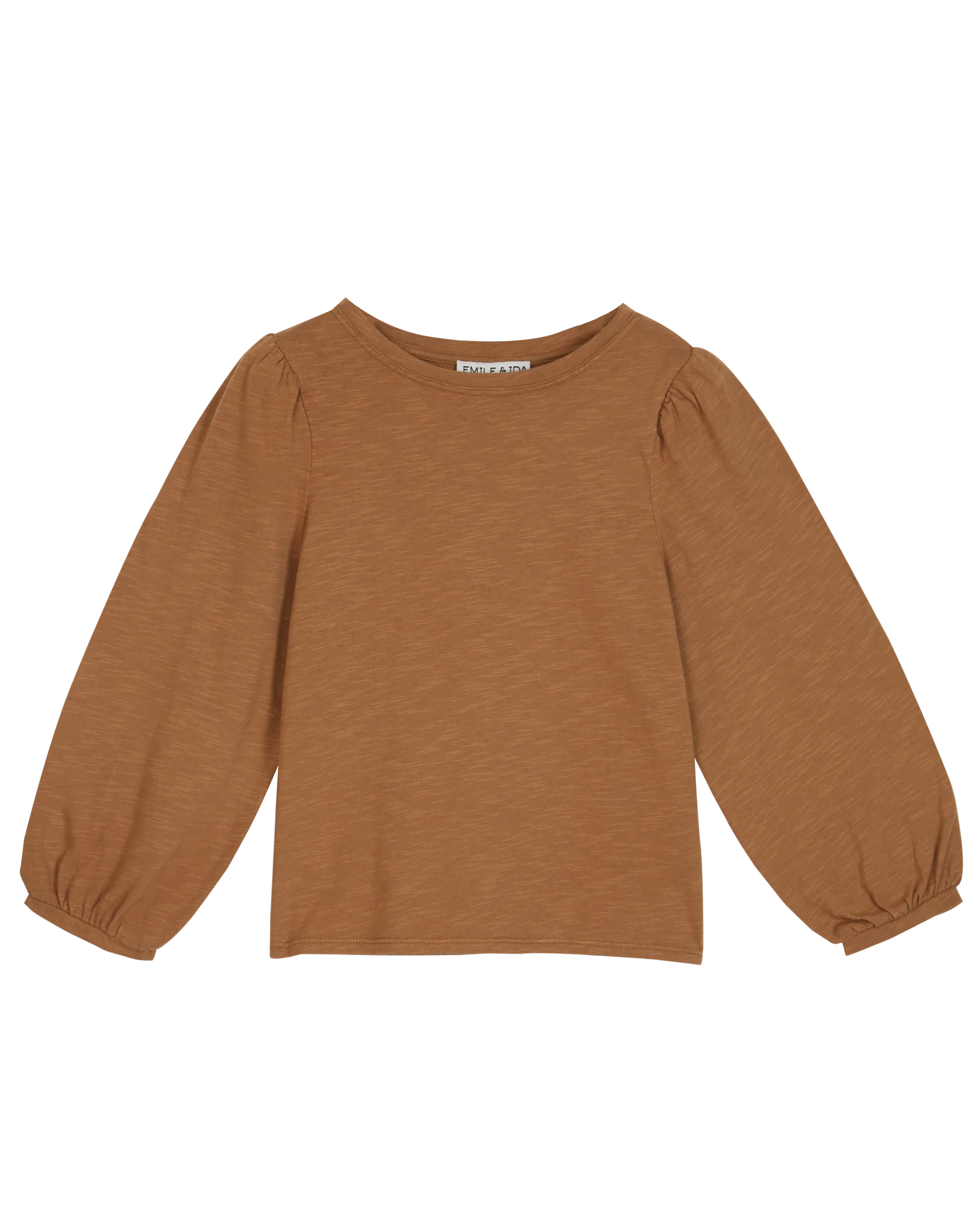 Tee-shirt en jersey de coton biologique caramel. La coupe près du corps de ce tee-shirt tout doux s’oppose à la grande largeur des manches dont les fronces en tête de manches et aux poignets sont à l’origine.