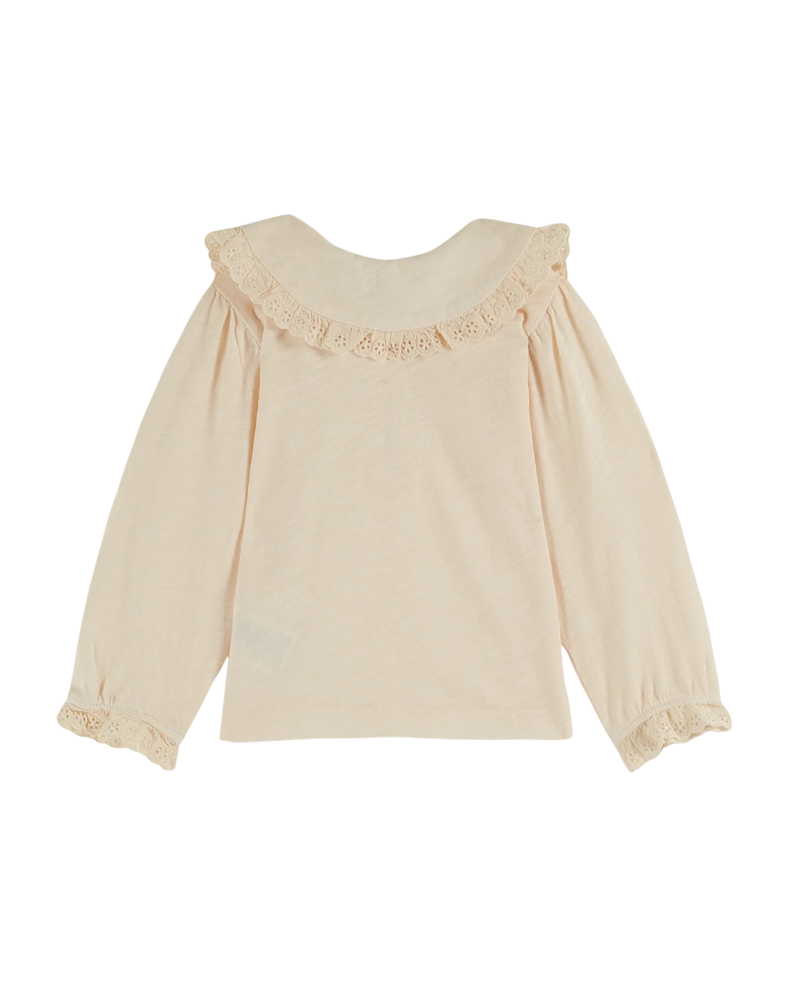 Encore un tee-shirt qui ne ressemble à aucun autre. En effet, le grand col qui entoure l’encolure ronde et recouvre les épaules, la patte de boutonnage façon polo et les poignets élastiqués des manches longues sont ornés d’une bande de broderie anglaise froncée ton sur ton.