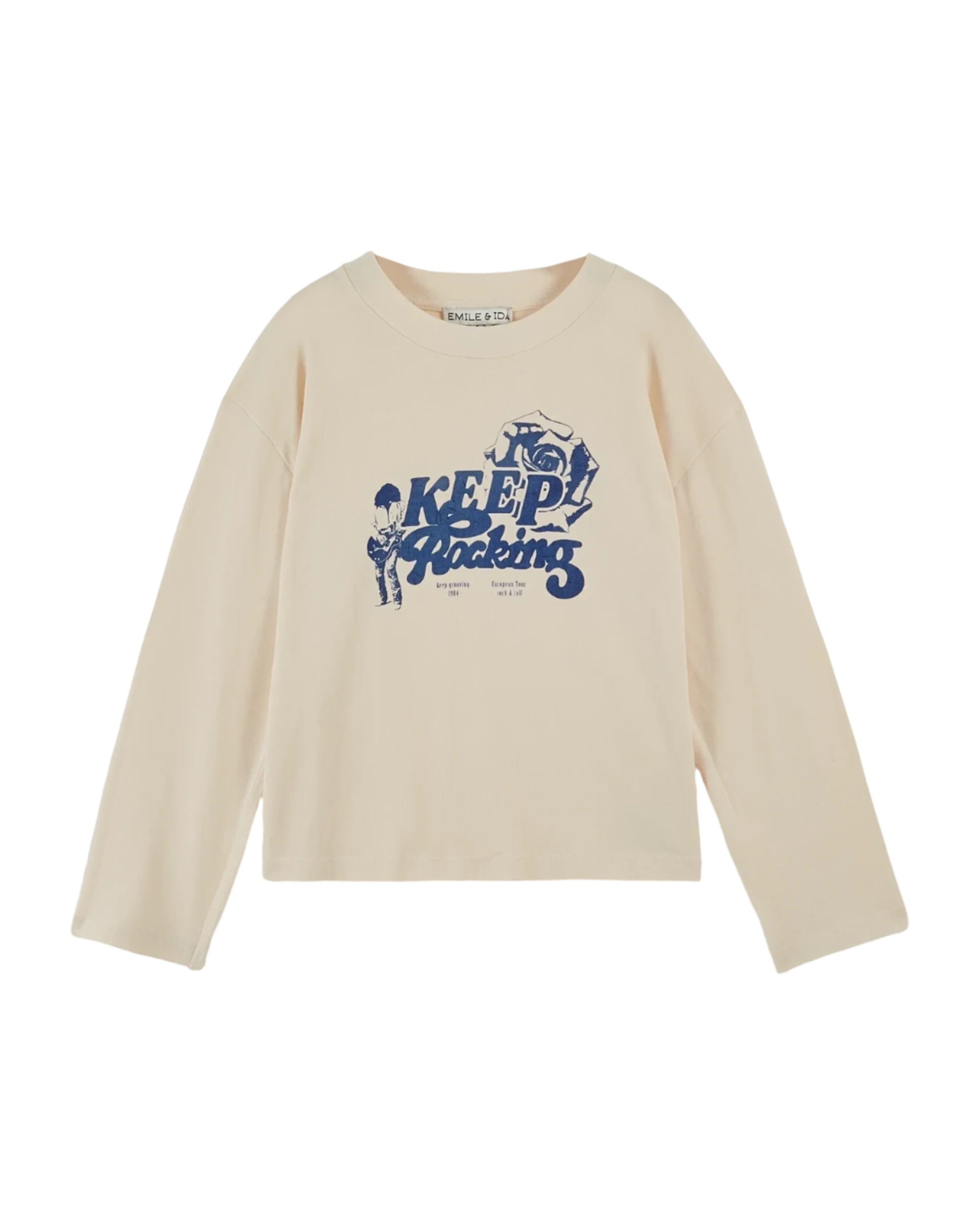 Encore un tee-shirt qui ressemble à tous les tee-shirts de chez Emile et Ida. La matière toute douce, les manches longues terminées par une double surpiqure (comme la base) et l’encolure ceinte d’un bord-côte ton sur ton. Ce qui le différencie des autres et que vous ne trouverez pas ailleurs… c’est le print « Keep Rocking » qui incitera vos fils à continuer de se balancer tout en gardant le rythme.