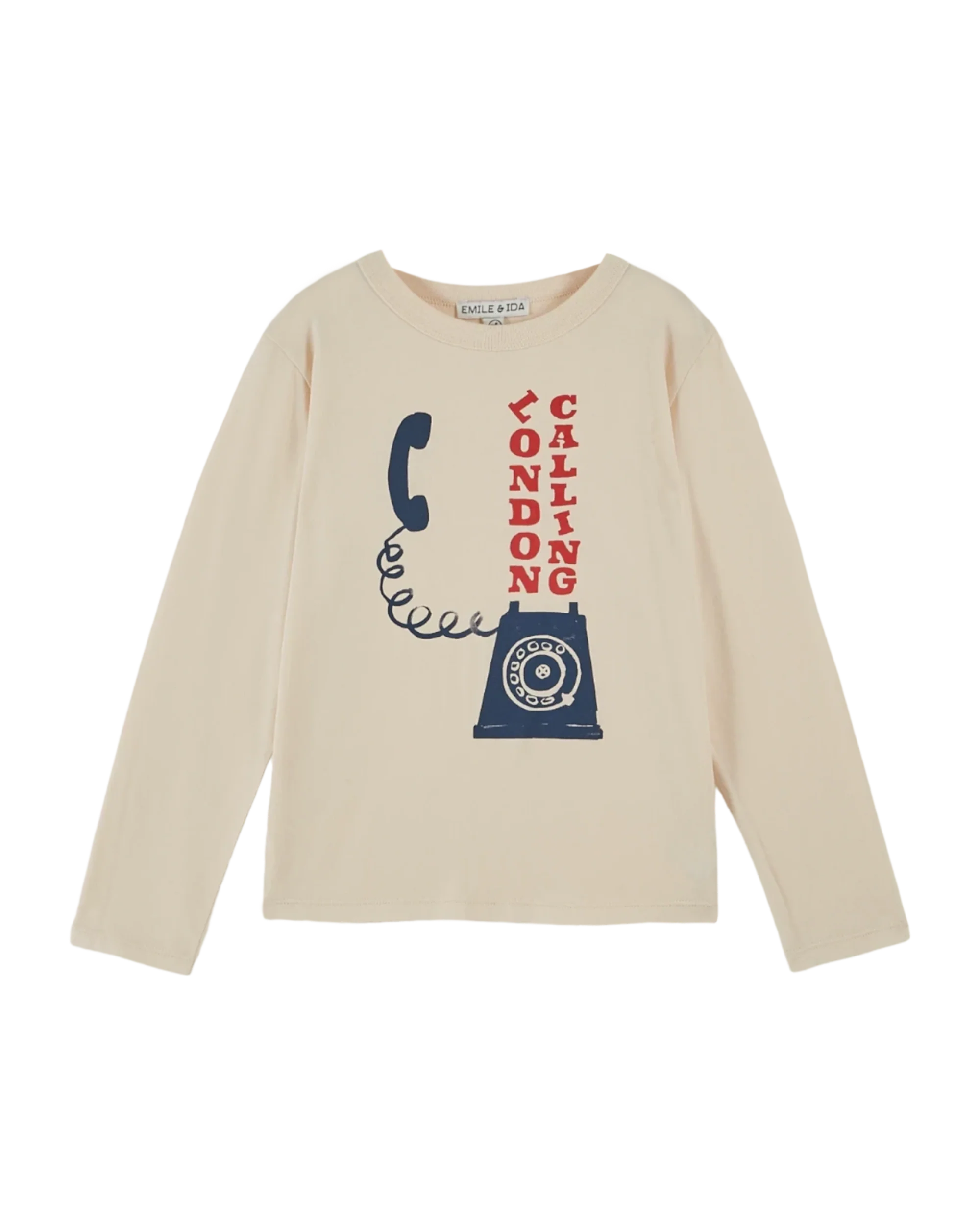 Tee-shirt en jersey de coton biologique écru. La matière toute douce, les manches longues terminées par une double surpiqure (comme la base) et l’encolure ceinte d’un bord-côte ton sur ton. Ce qui le différencie des autres et que vous ne trouverez pas ailleurs… c’est le print « London Calling » emprunté aux Clash.