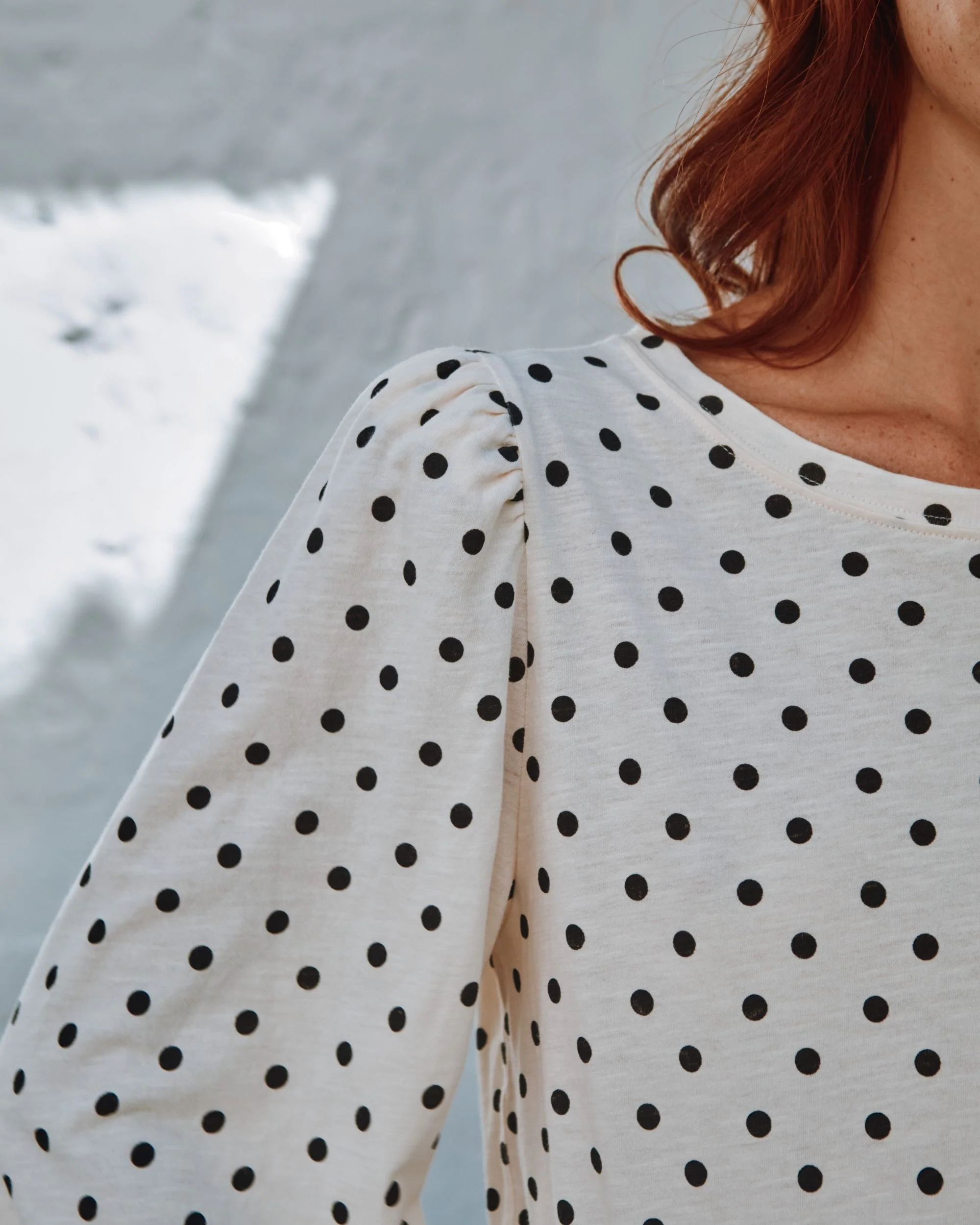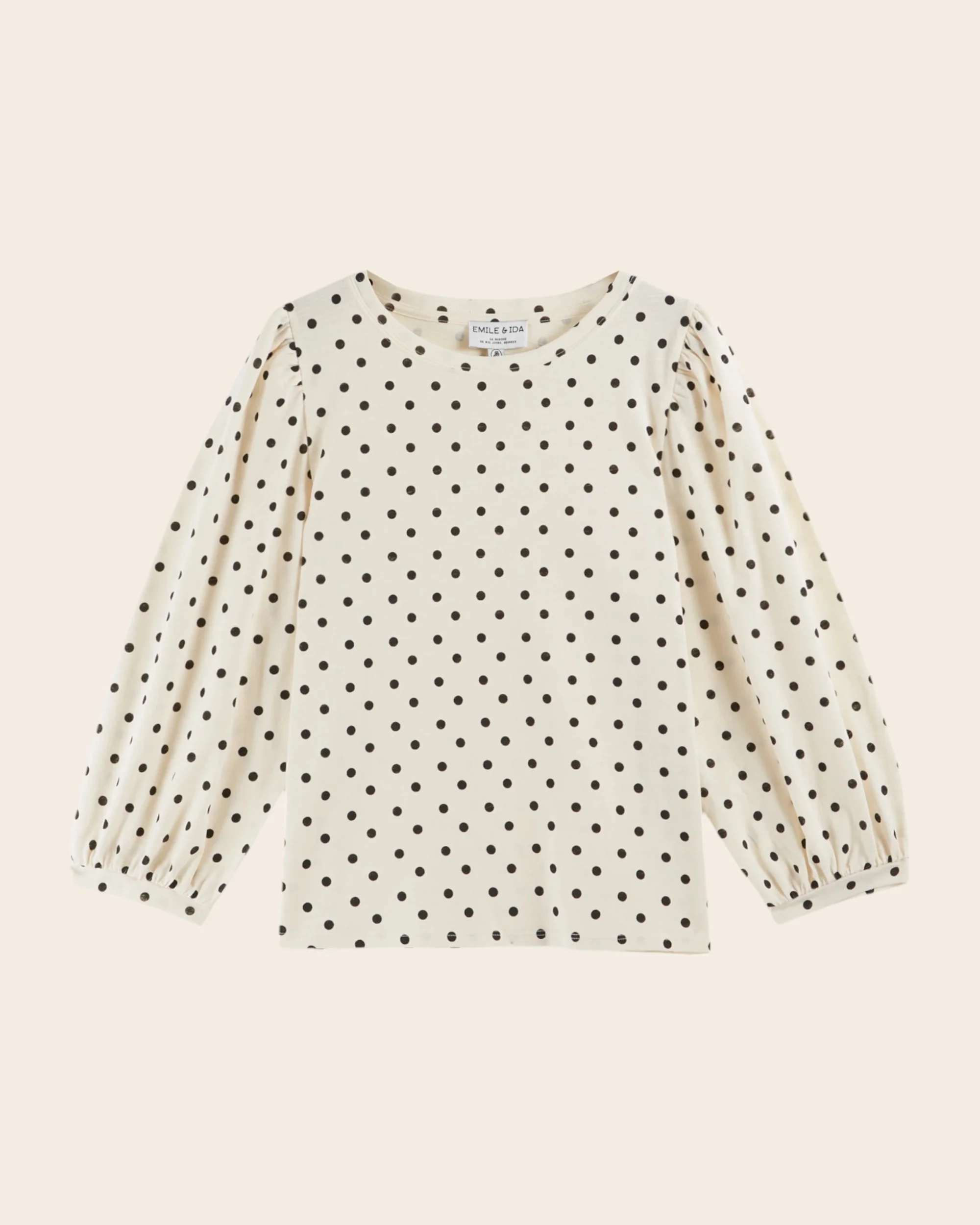 Tee-shirt à manches longues en jersey de coton biologique flammé écru imprimé de pois noirs. – Coupe droite – Matière d’une grande douceur – Encolure ronde – Fronces en tête de manches – Manches bouffantes resserrées aux poignets