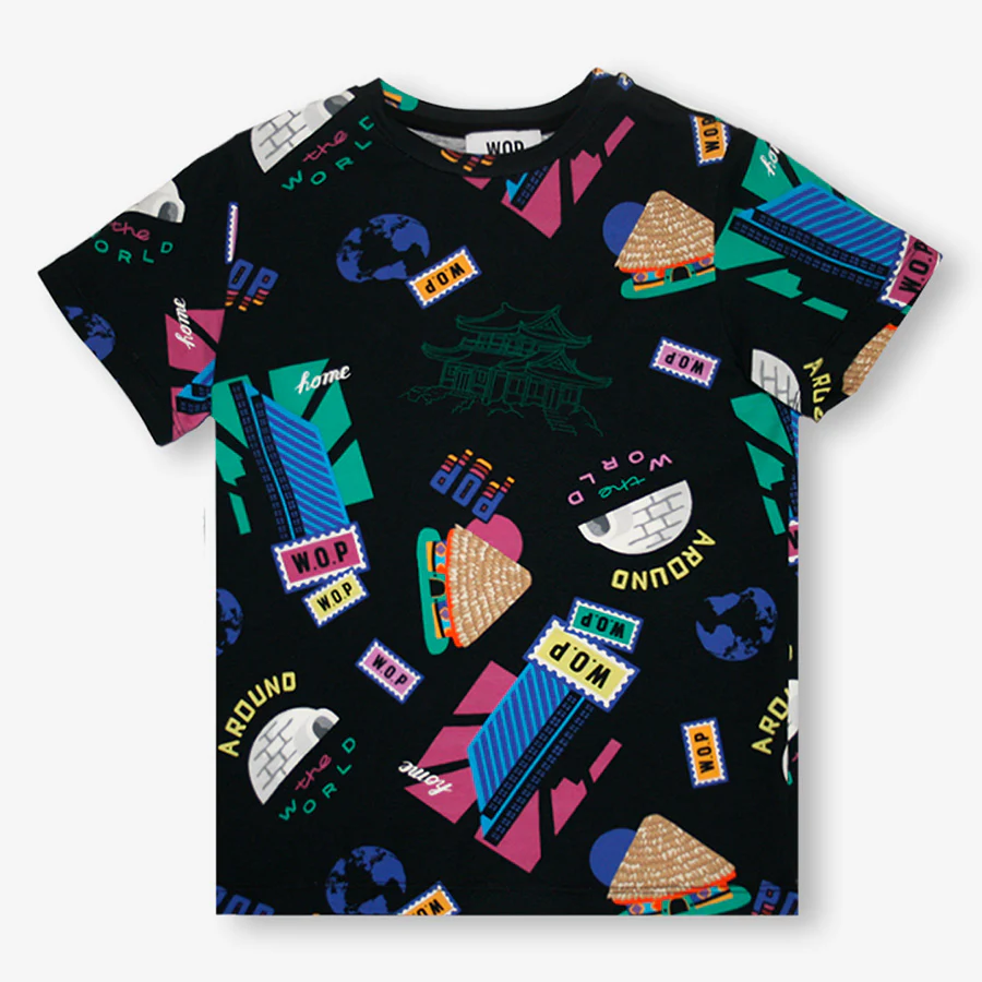 Explorez l’univers avec style dans notre T-shirt noir imprimé « Home World » en coton bio pour enfants de W.O.P World Of Pop.