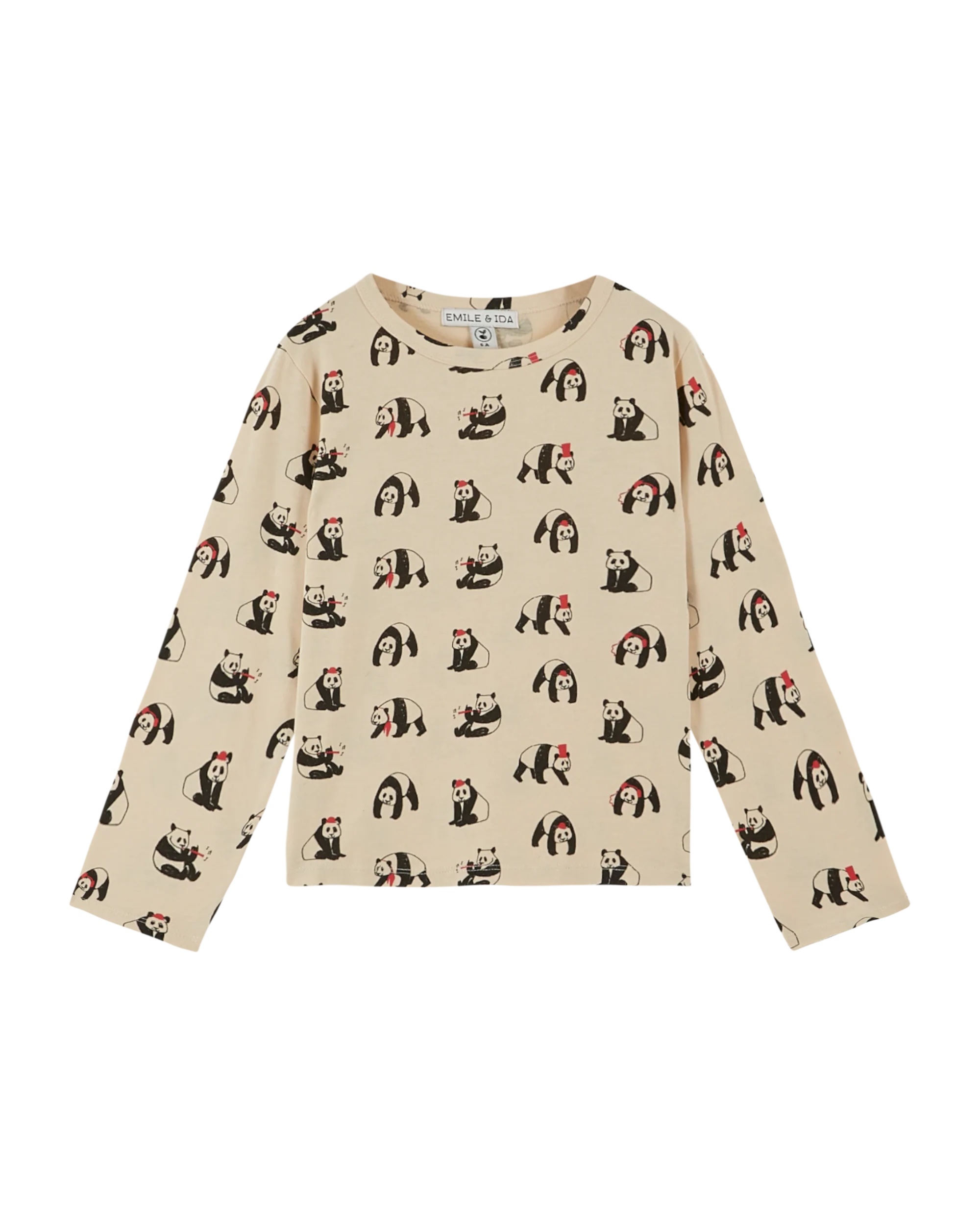 Tee-shirt en jersey de coton biologique beige sur lequel s’amusent des pandas facétieux.