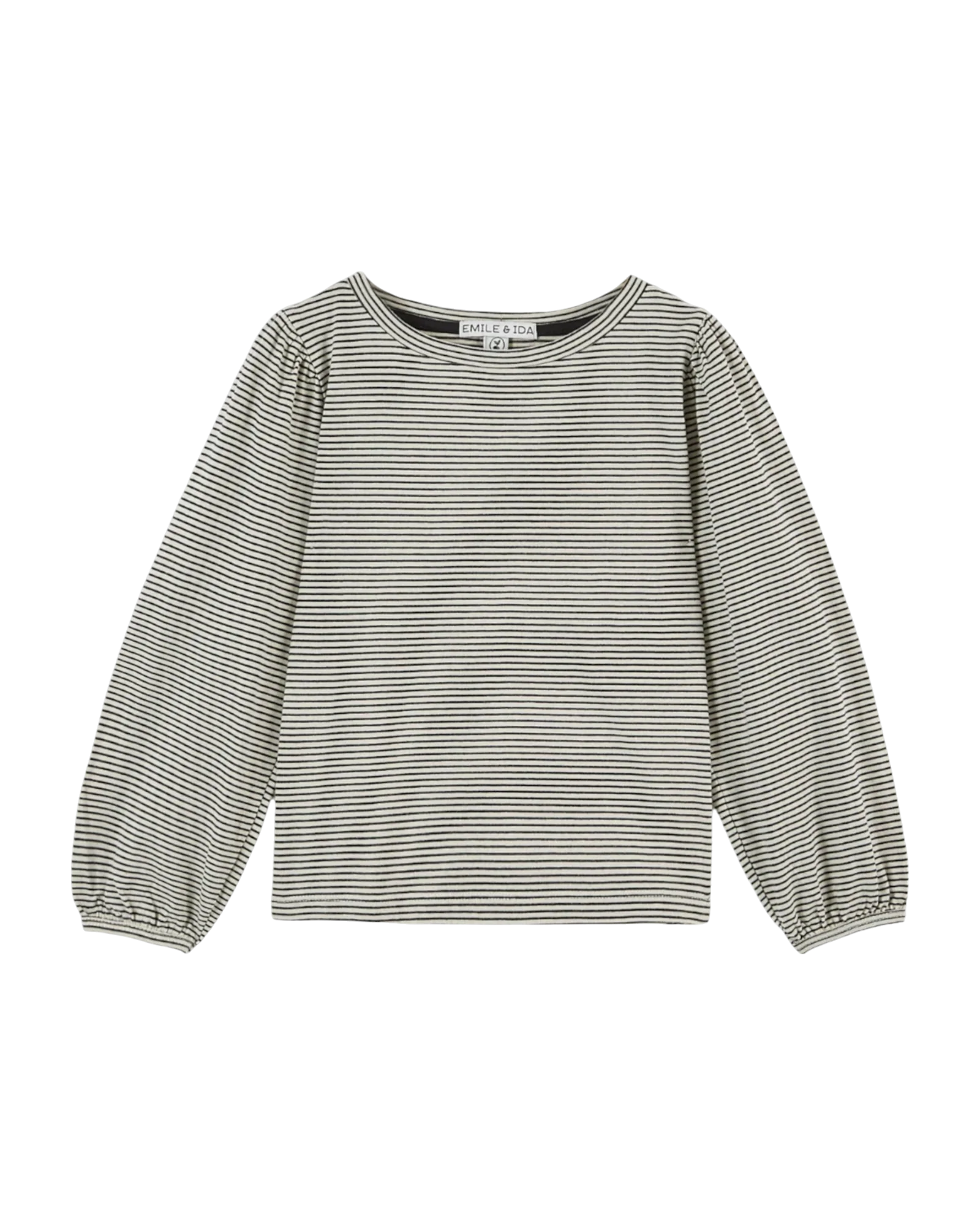 Tee-shirt en jersey de coton biologique rayé écru et noir. Encore un tee-shirt confectionné dans une matière épaisse pleine de douceur et de chaleur. Coupe droite, manches longues bouffantes, grâce aux fronces en tête de manche, resserrées aux poignets par une manchette toute fine de bord-côte comme l’encolure légèrement échancrée.