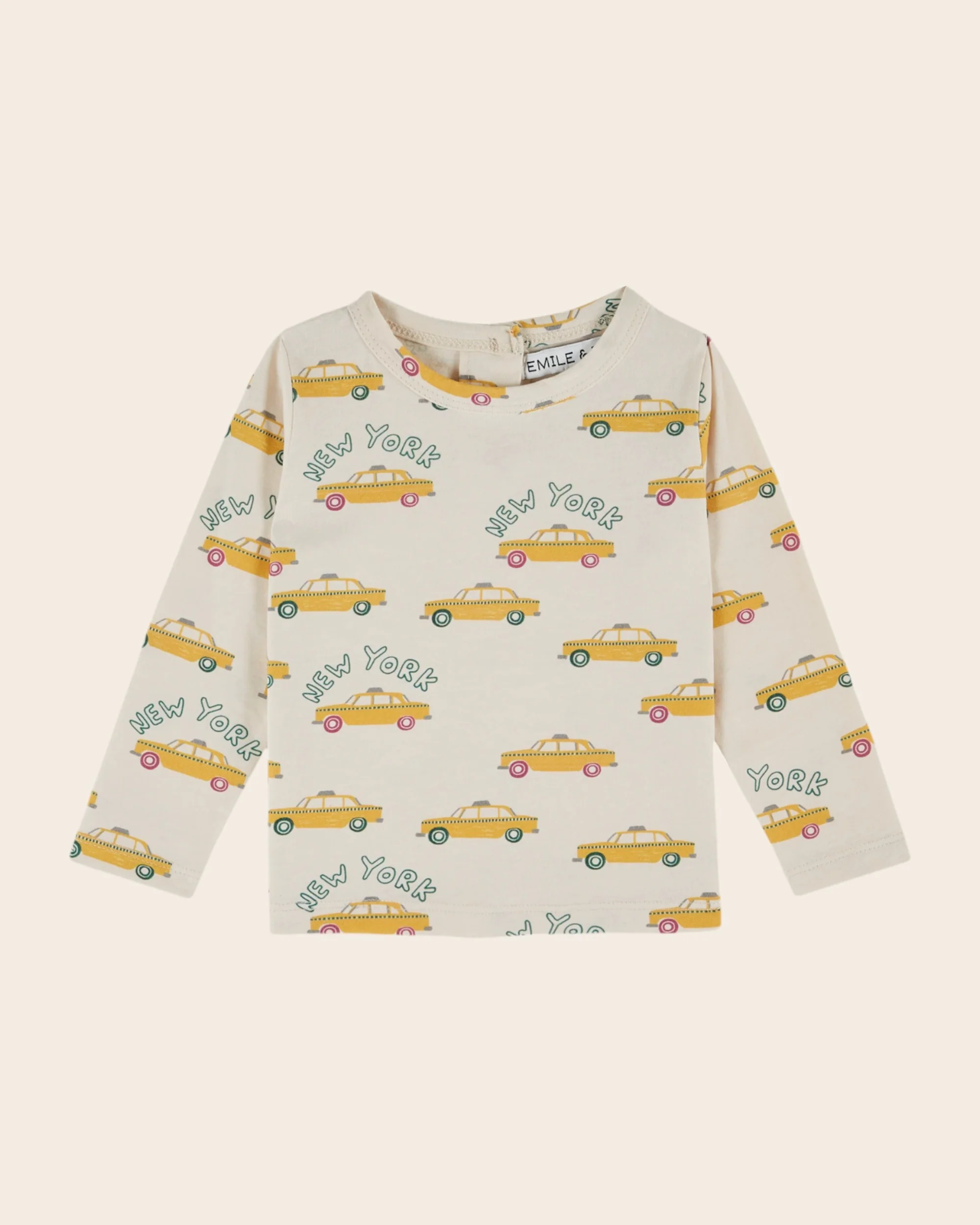 Tee-shirt en jersey de coton biologique beige imprimé en all-over de taxis New Yorkais.– Coupe droite– Bord-côte autour de l’encolure– Manches longues ourlées aux poignets– Patte de boutonnage dans le dos ou sur l’épaule pour les tailles bébé