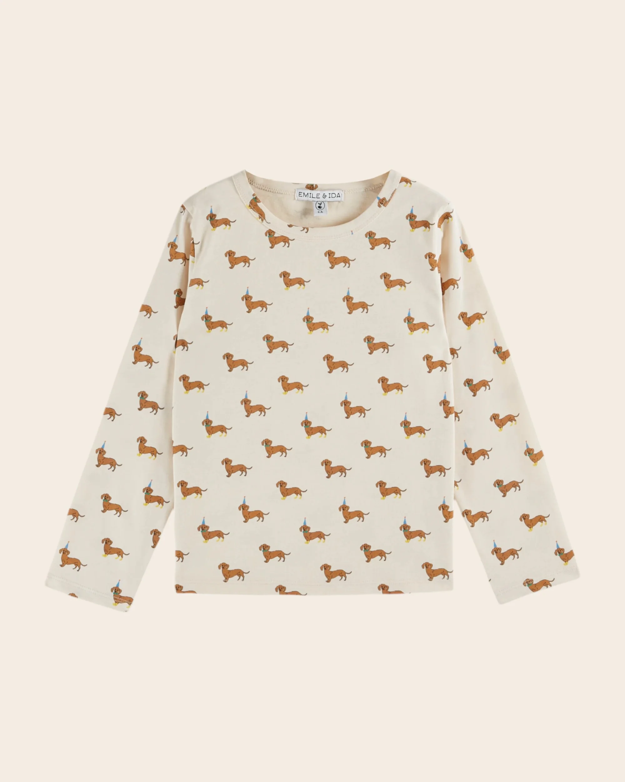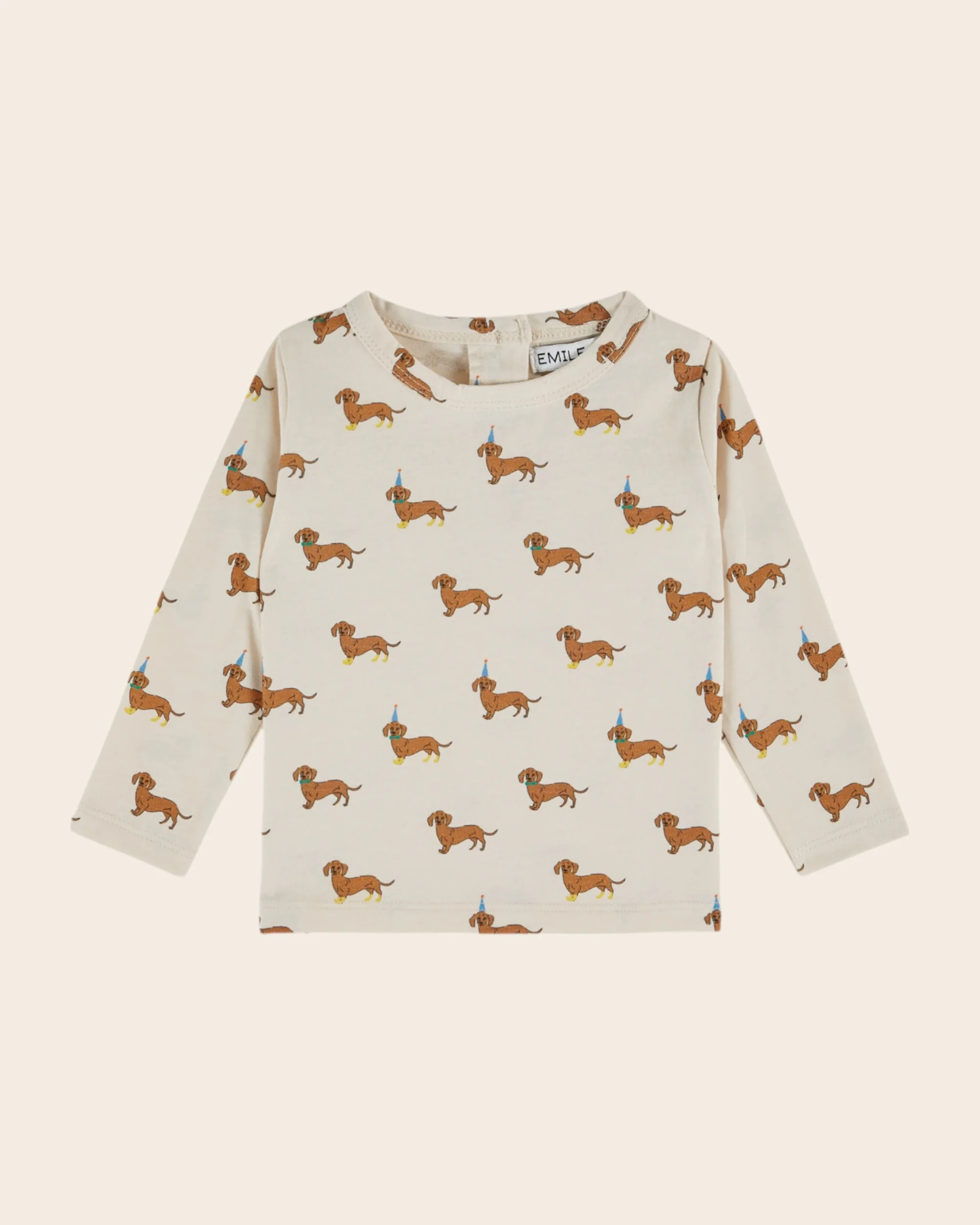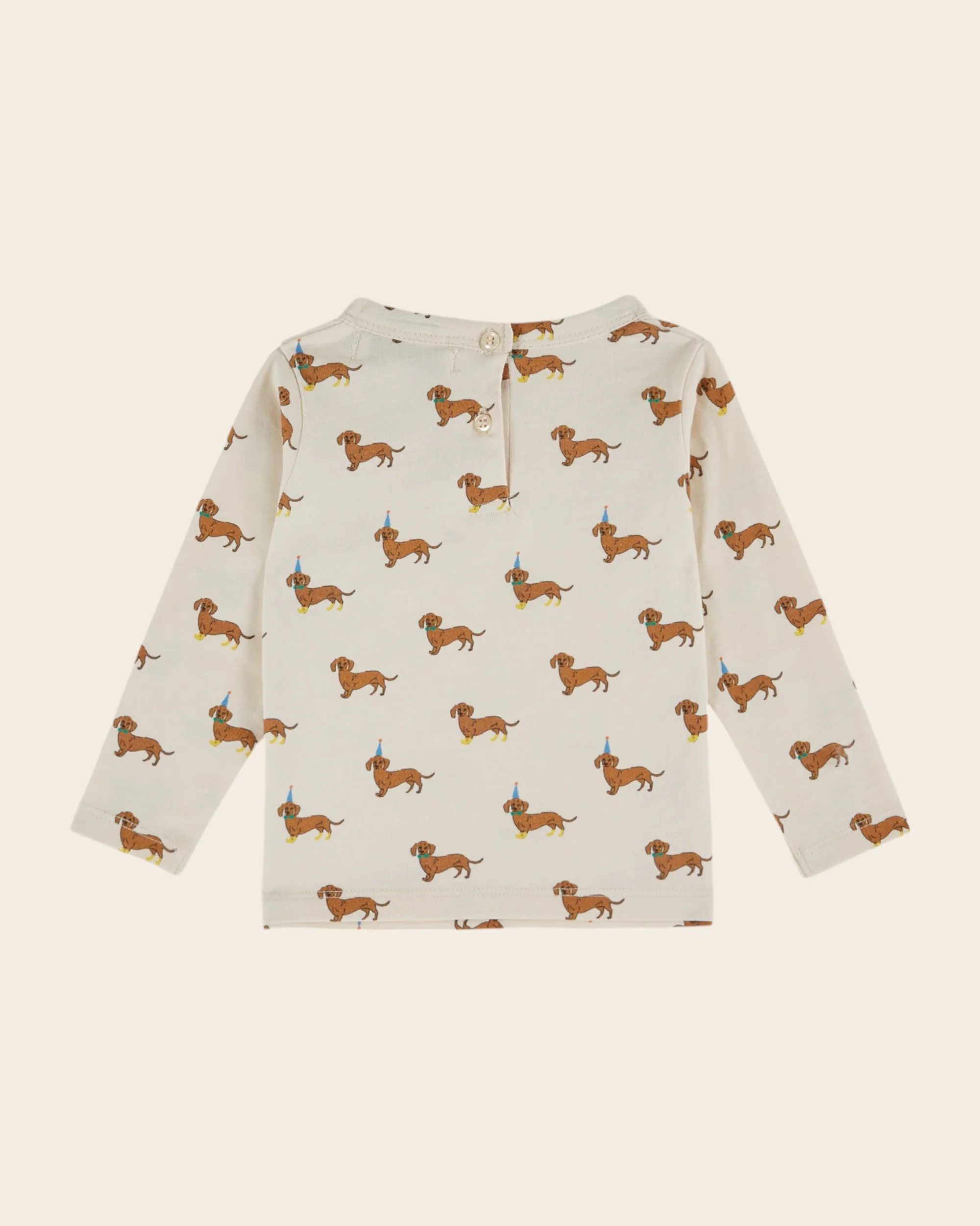 Tee-shirt en jersey de coton biologique écru imprimé de teckels caramel à bottes jaunes, nœuds papillon verts et chapeaux pointus bleus. C’est la fête chez les teckels !