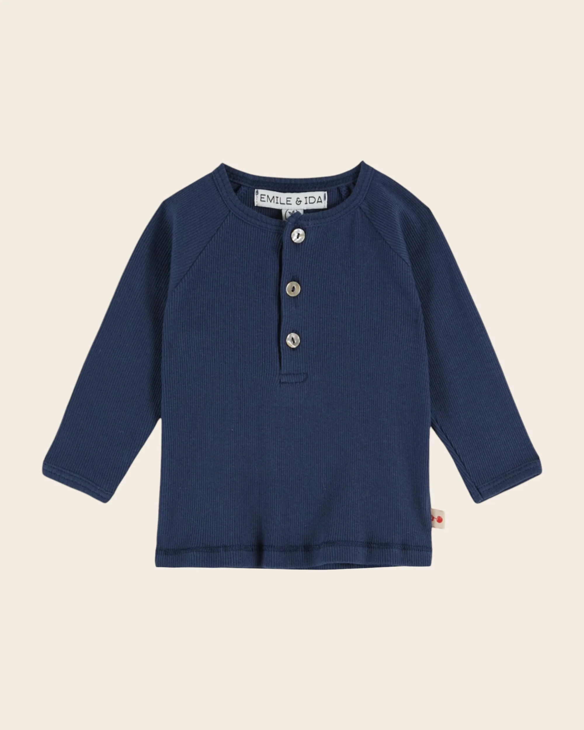 Tee-shirt tunisien en côtes de coton biologique bleu nuit. – Forme droite extensible – Encolure ronde – Manches longues raglan – Ouverture boutonnée sur le devant – Boutons en nacre naturelle – Ourlet de la base surpiqué Les finitions de l’encolure et des bas de manches sont en bord-côte rapporté.