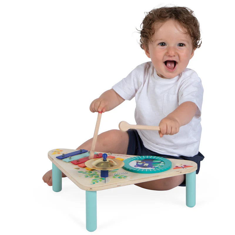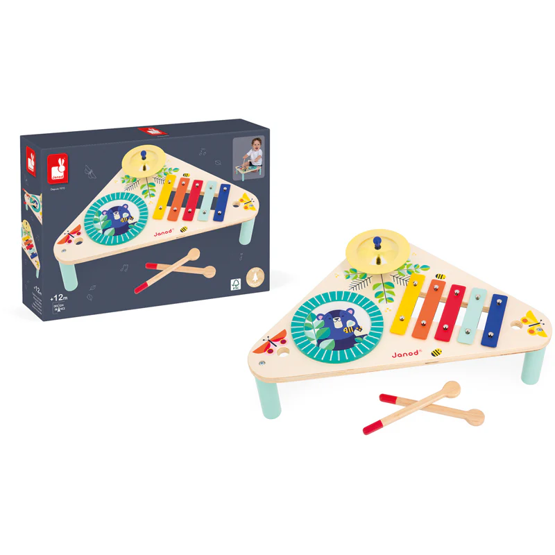 Le concert peut commencer ! Avec cette jolie table musicale haute en couleur, les plus petits se feront une joie d’imaginer les plus belles musiques. Cette table se compose d’une cymbale, d’un tambour et d’un xylophone. Pratique ! Pour ne pas perdre les baguettes, elles peuvent être rangées dans les trous sur les côtés de la table ! Jouet d’imitation musical idéal pour accompagner votre enfant dans l’apprentissage et la découverte des sons. Jouet en bois FSCTM. Pour les enfants à partir de 12 mois.