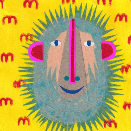 Un portrait de singe de la série Color Collage,réalisé en technique mixte : peinture acrylique, pastels, collage de papiers d’emballages colorés et