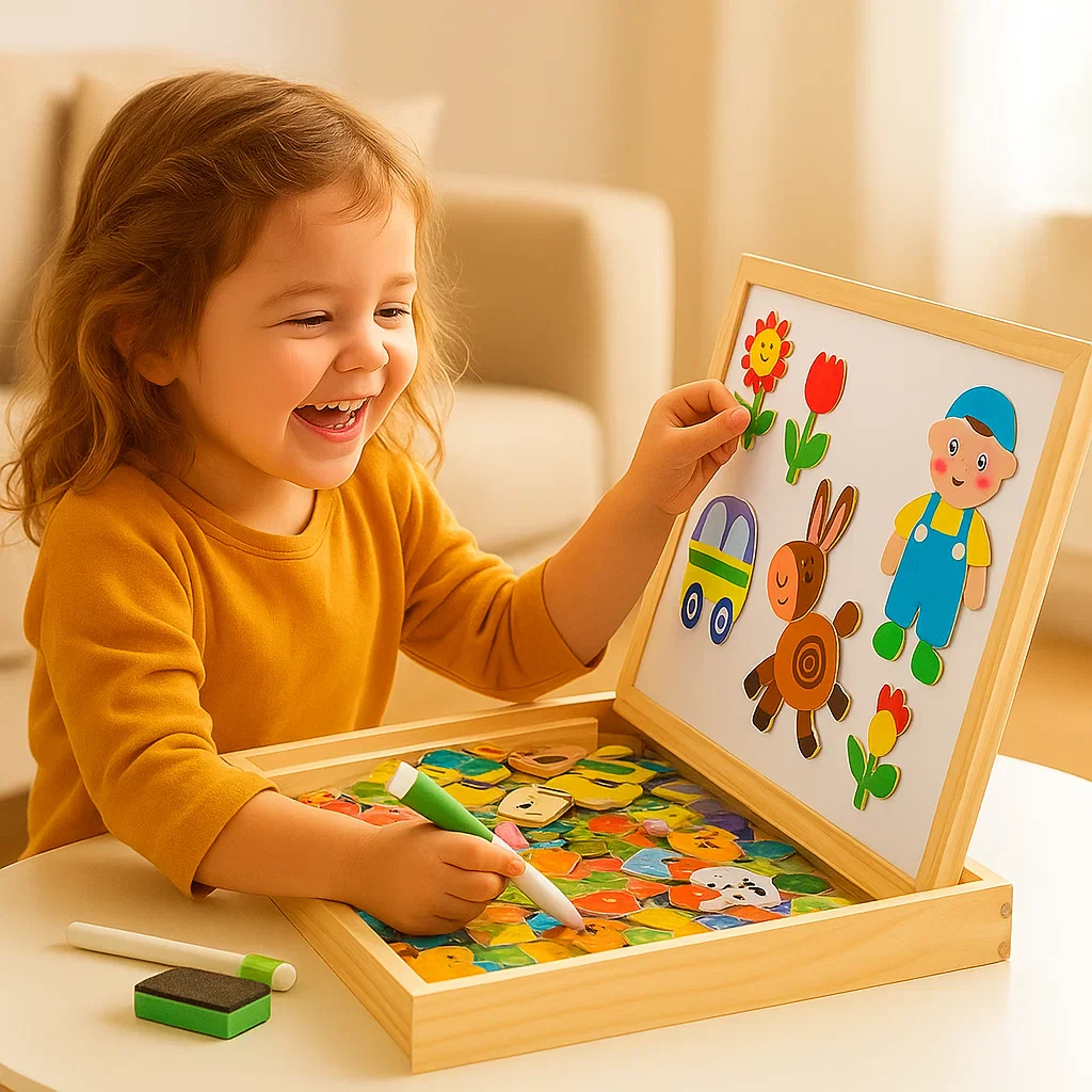 Conçu pour plusieurs âges et étapes d’apprentissage, ce jouet évolue avec votre enfant. Les jeunes enfants peuvent commencer par trier les formes et reconnaître les couleurs, tandis que les plus grands créent des scènes et des scénarios complets à l’aide du tableau. Facile à nettoyer et à ranger, il est parfait pour les parents occupés à la recherche d’un jouet éducatif sans dégâts qui soit réellement utilisé.