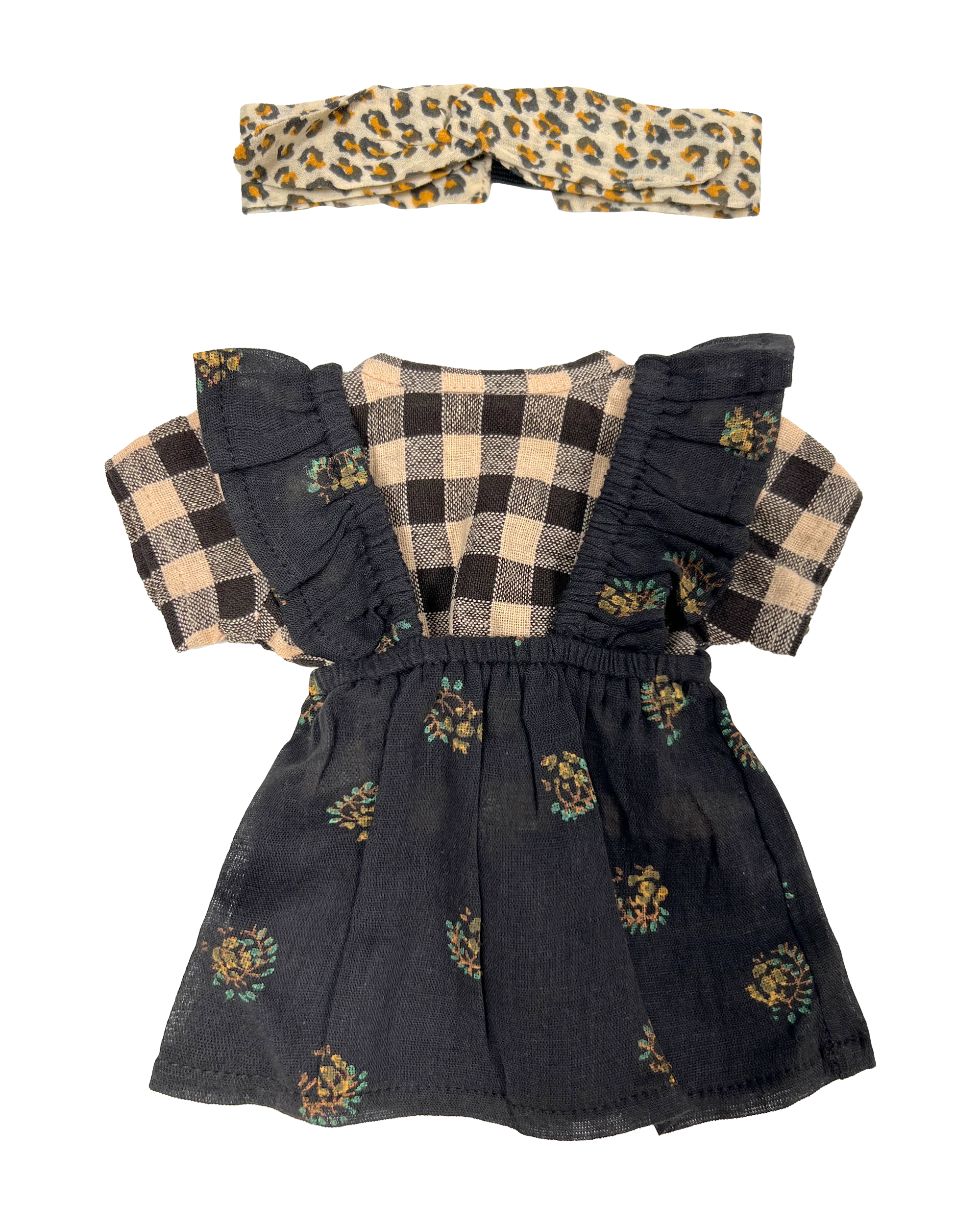 Tenue de poupée composée d’une robe à bretelles volantées en voile de coton bitume imprimé de groseilles avec des blocks print par des artisans indiens aux mains expertes, d’un bandeau en coton imprimé d’ocelles de léopard et d’une blouse à manches courtes en coton vichy café.