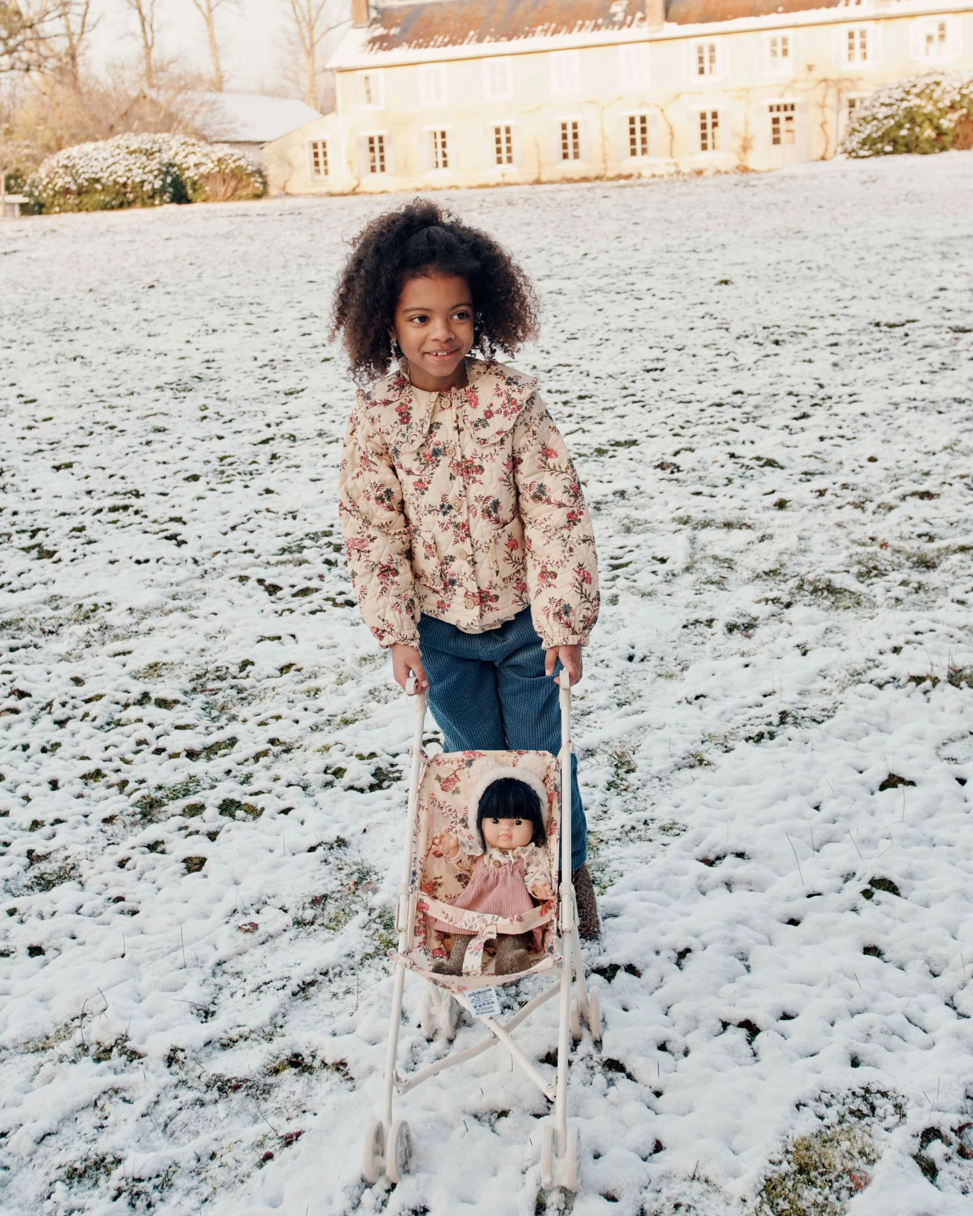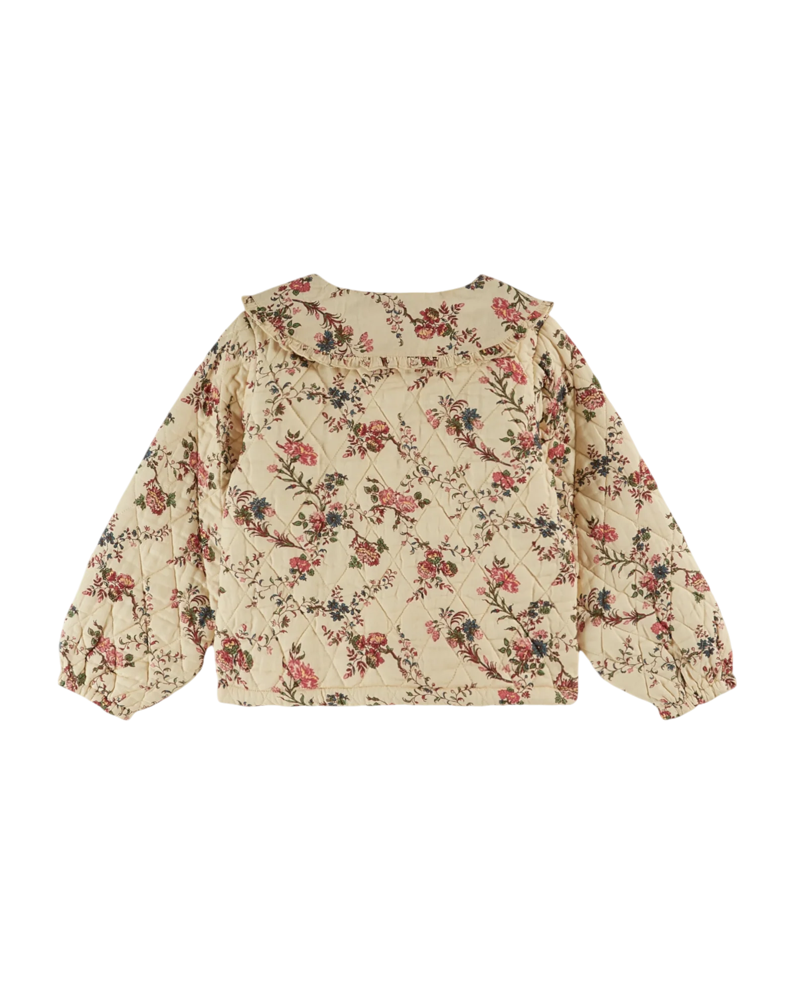 Veste matelassée en coton dont le fond beige est parsemé de rinceaux fleuris et feuillagés dans un camaïeu de rose et de vert. Coupe droite, manches montées élastiquées aux poignets, fleurs brodées à la main sur le col plat rehaussé d’un froufrou froncé autour de l’encolure ras du cou et boutons en bois qui ferment la veste sur toute la hauteur. Deux poches dont le pourtour est orné d’un volant froncé se sont fait plaquer sur le devant. On y dissimule des bonbons, un mouchoir voire des mots doux.