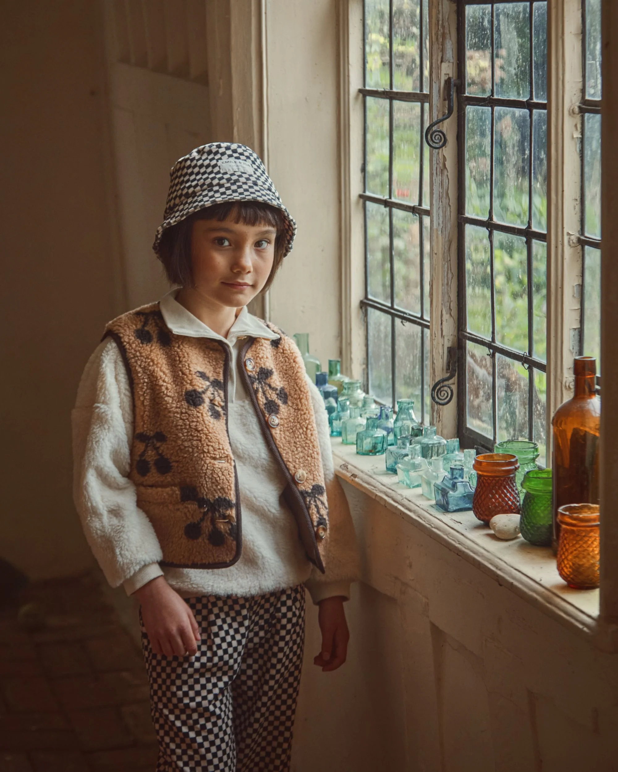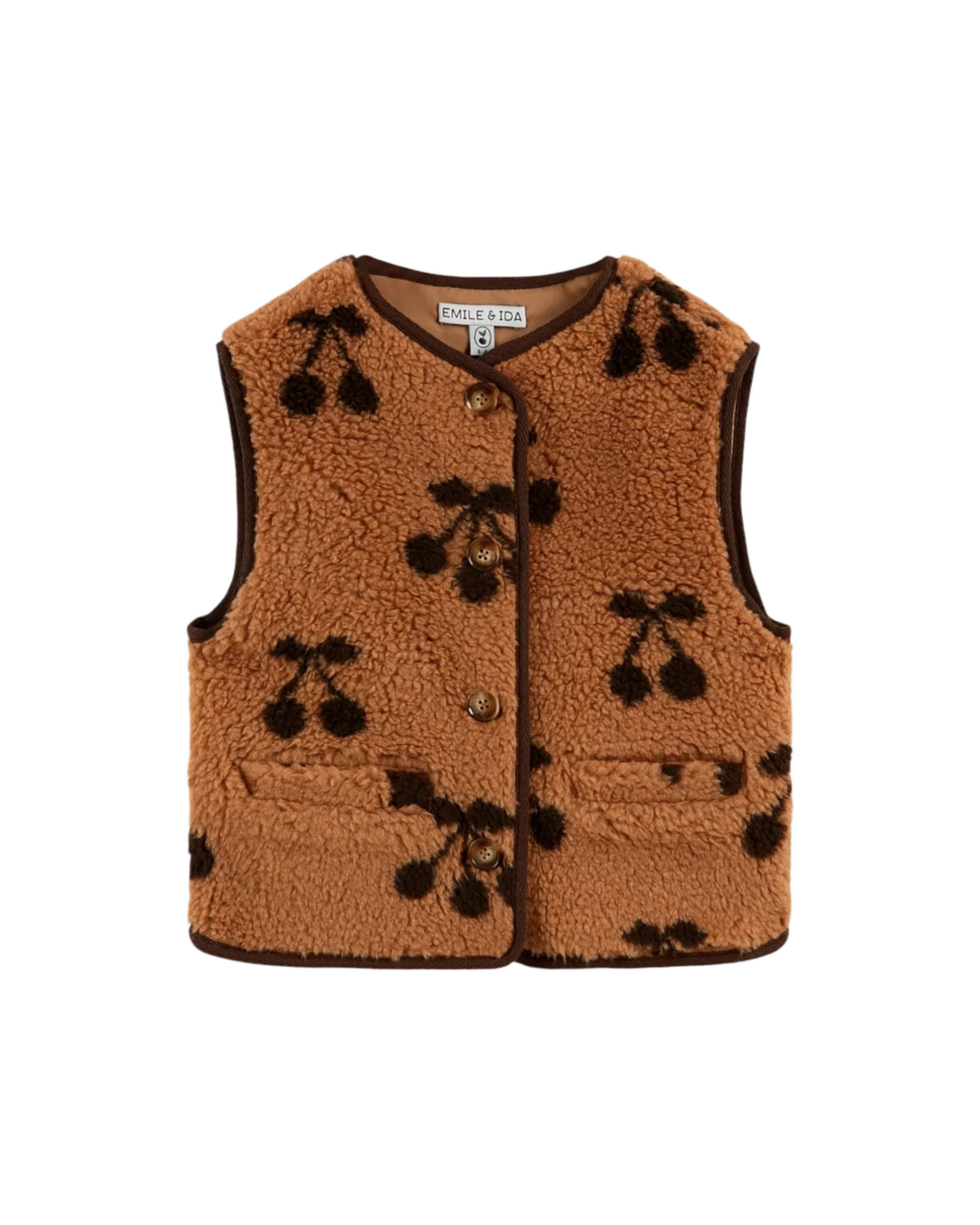 Veste sans manches en fibres synthétiques marron glacé imprimé en all-over de bouquets de grosses cerises noires. Nous avons sélectionné cette fausse fourrure épaisse, douce et moelleuse pour vous offrir une pièce hyper confortable qui ne laissera pas le froid vous envahir. Il est doté de poches passepoilées et tous les bords, de l’encolure ronde à la base, sont garnis d’un galon en sergé de coton marron. L’intérieur de la pièce est doublé de coton beige.