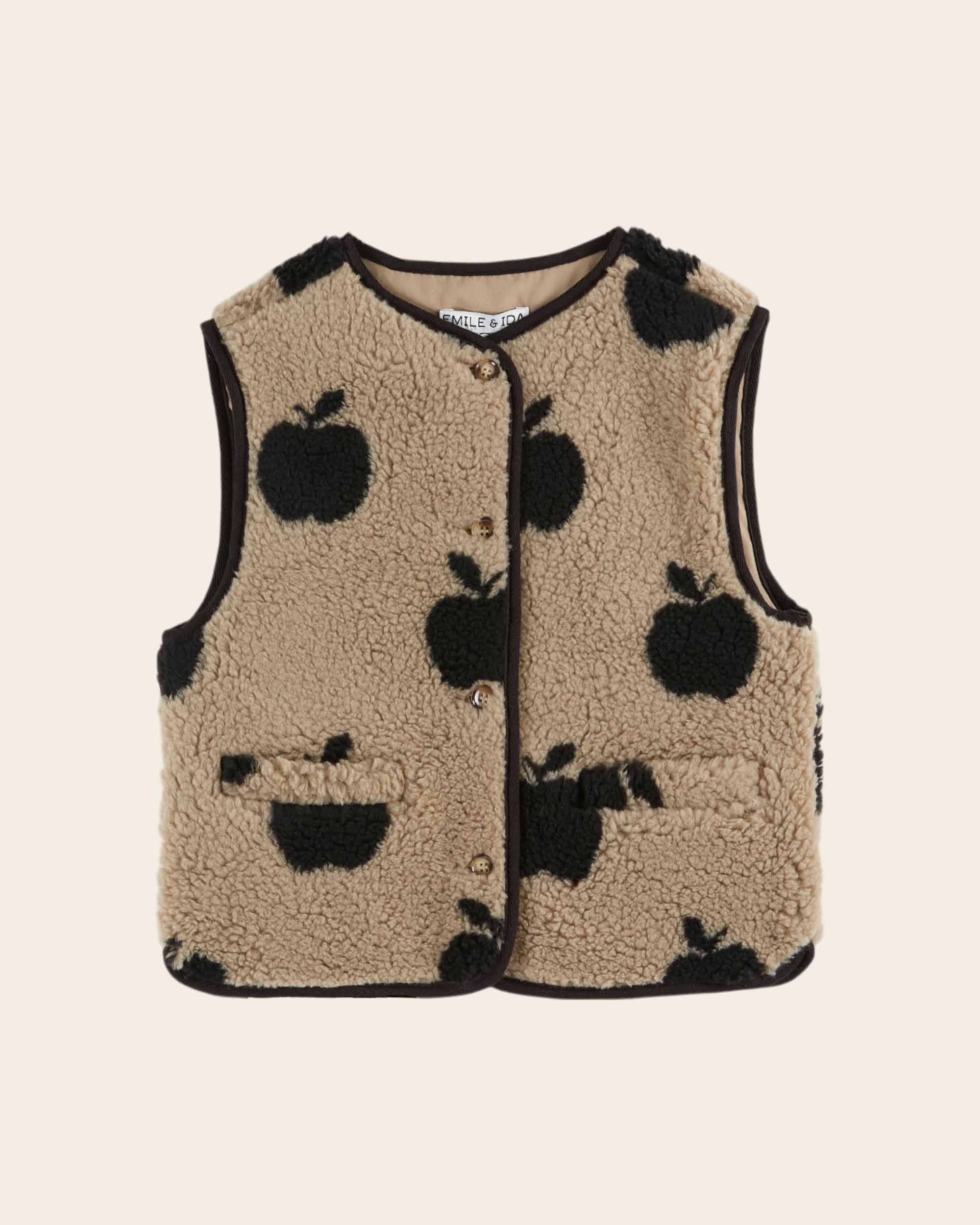 Gilet moumoute en fourrure synthétique grège imprimées de grosses pommes noires.
