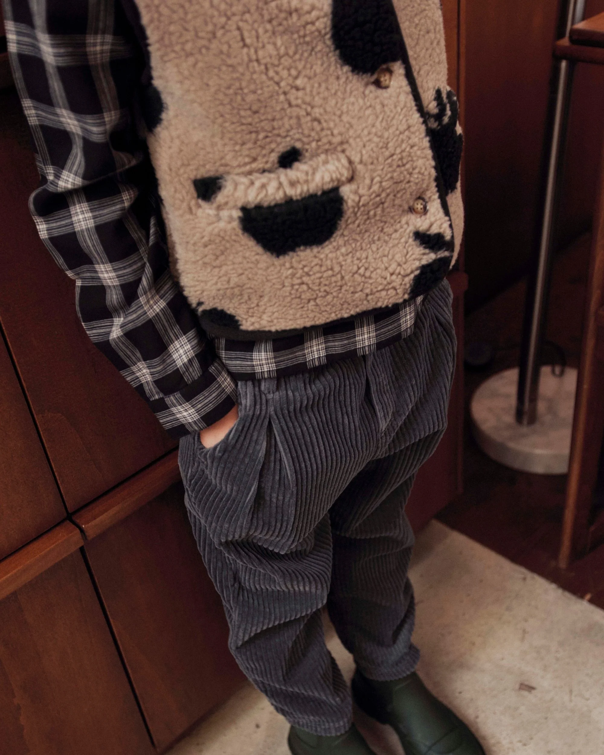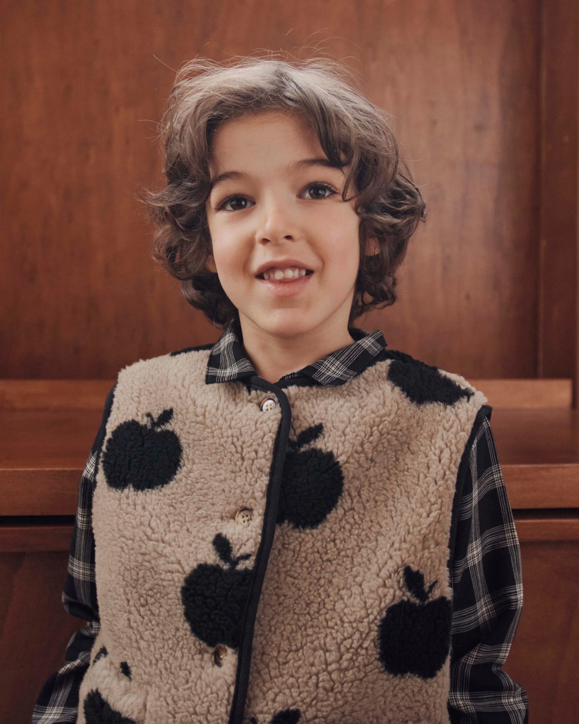 Gilet moumoute en fourrure synthétique grège imprimées de grosses pommes noires. – Forme droite – Deux poches raglan – Ouverture boutonnée sur toute la hauteur – Finitions en galon de sergé de coton noir – Doublé en jersey de coton ton sur ton