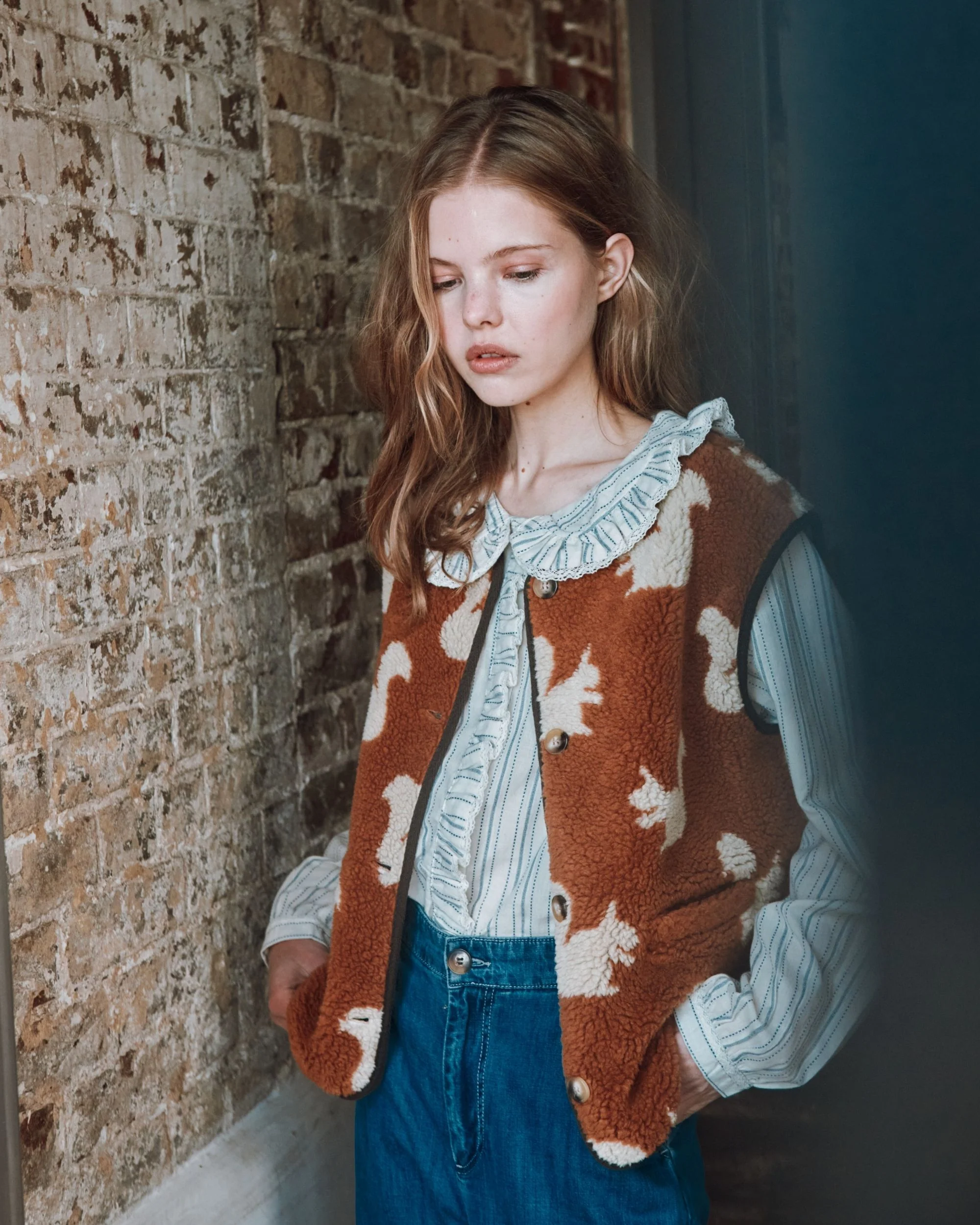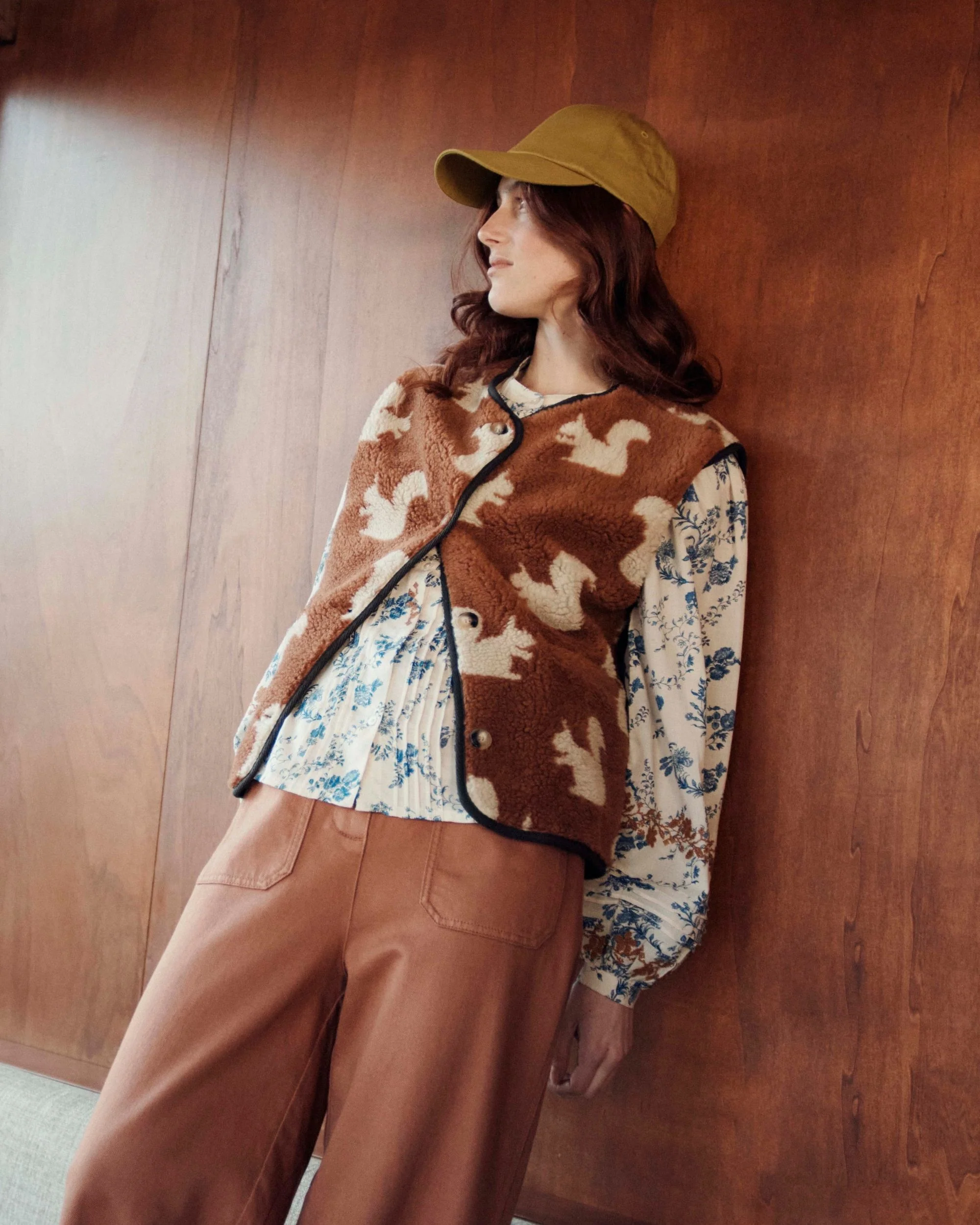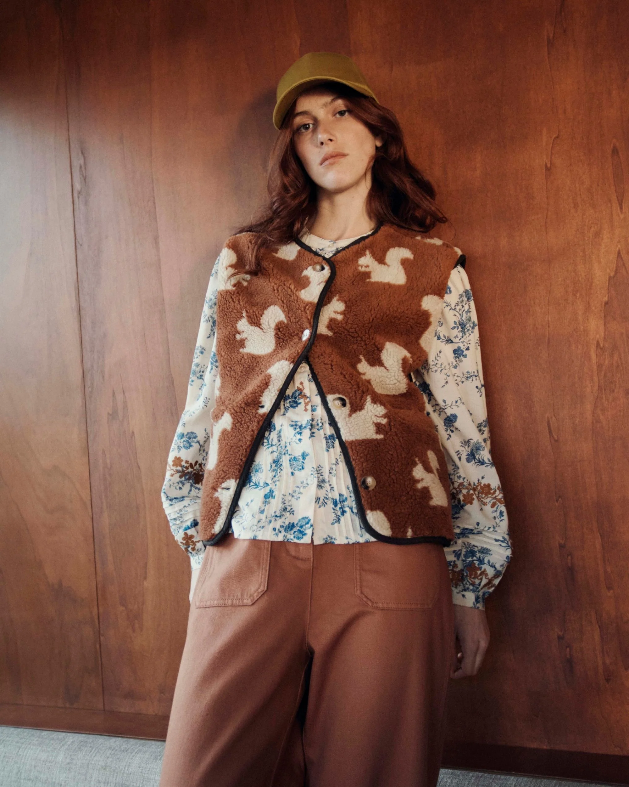 Gilet sans manches en fourrure synthétique marron imprimée d’écureuils beiges. – Encolure ronde – Matière sherpa toute moelleuse – Deux poches raglan sur le devant – Finitions de biais noirs en sergé de coton – Ouverture boutonnée sur le devant