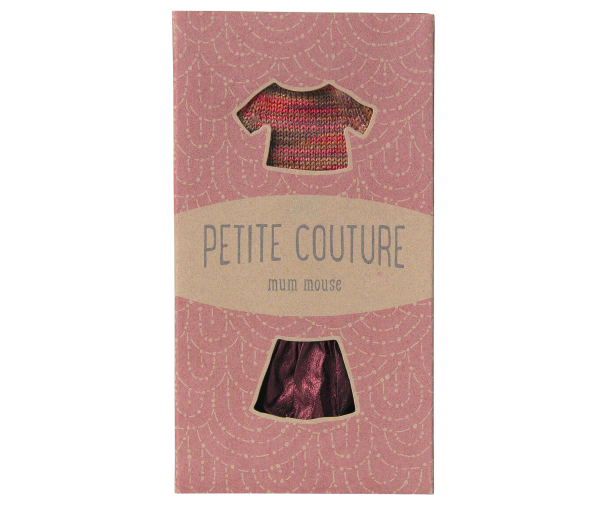Si vous cherchez une nouvelle tenue à votre souris Maman, cet ensemble sera un bon choix. La tenue se compose d’un top tricoté multicolore et d’une jupe aux reflets brillants roses.