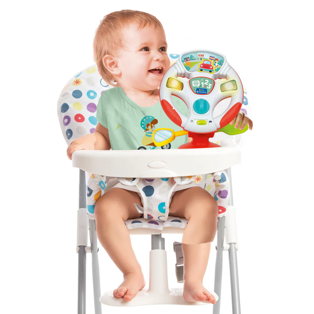 Un volant électronique parlant plein d’activités pour aller à toute vitesse vers des moments de plaisir ! Un bouton éducatif permet à l’enfant d’apprendre les chiffres grâce à des comptines amusantes. Contient des lumières LED, de nombreux effets sonores, des sons d’animaux et des mélodies amusantes. En tournant le volant, la voiture interactive se déplace de droite à gauche le long du parcours illustré et active des contenus liés à une véritable expérience de conduite. La clé active deux modes de jeu : moteur allumé ou éteint. Le rétroviseur et le levier de vitesse bougent tandis que les activités mécaniques aident l’enfant à développer ses aptitudes manuelles. Le volant est doté d’une ventouse pratique qui permet de le fixer facilement.